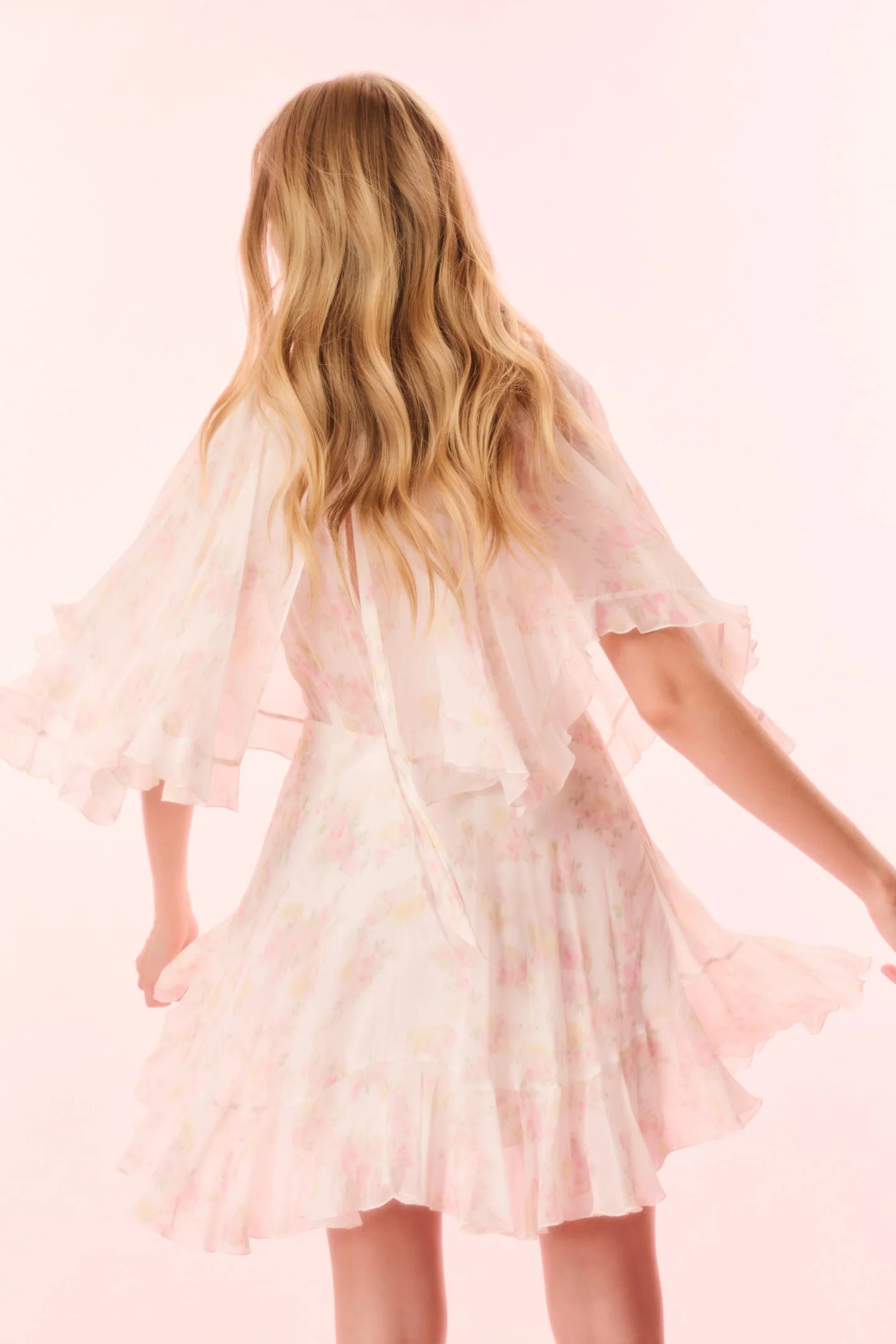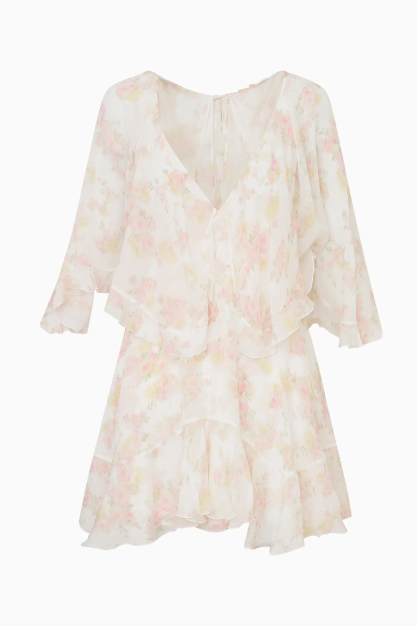 Introducing the Avaline Dress. This Bohemian-inspired piece debuts with a diaphanous chiffon fabric. The romantic mini features cape sleeves, a center back slit, ties at the neck opening and in the back for an elegant and feminine look.