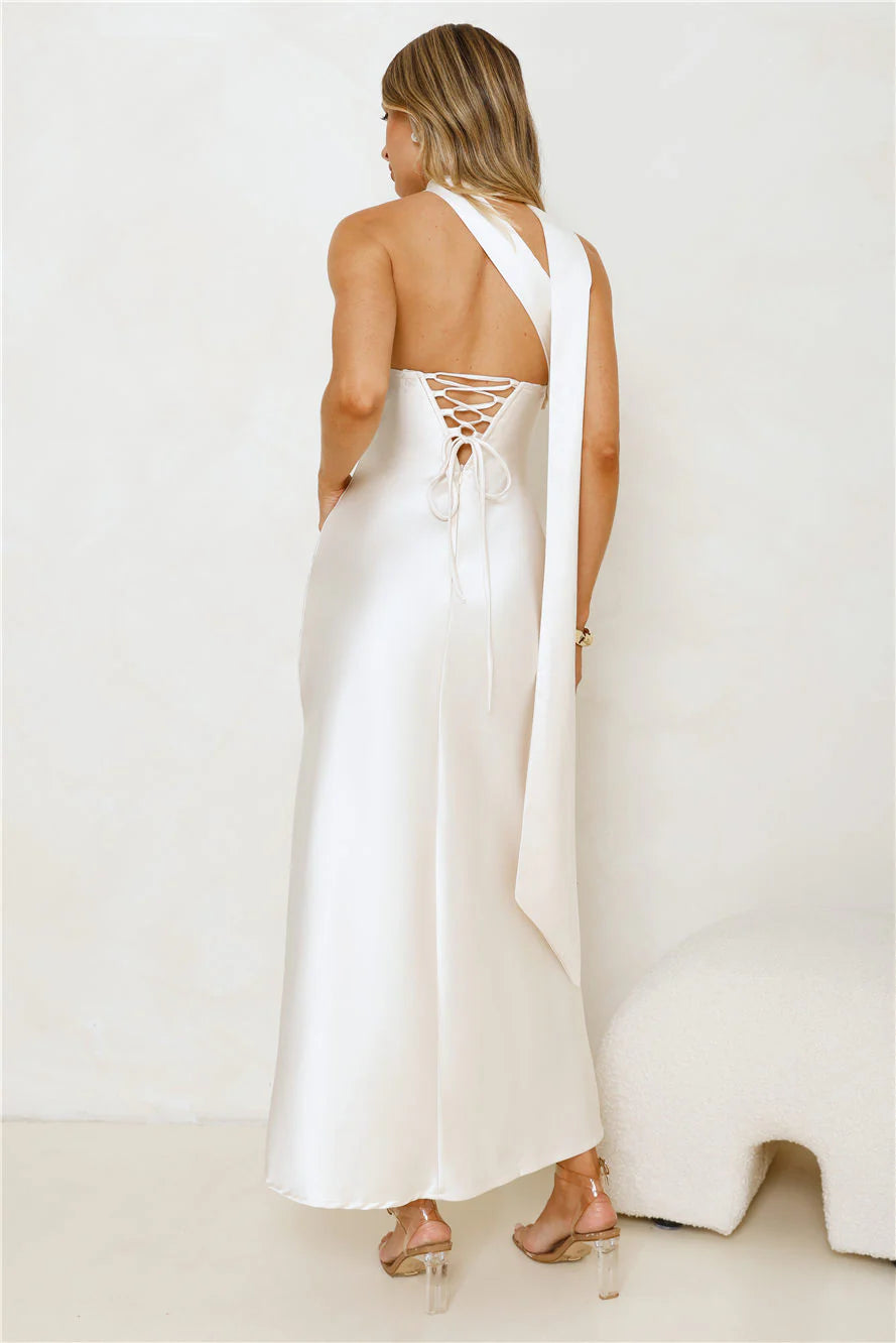 The Be Noticed Strapless Satin Maxi Dress features an elegant neck wrap, a gathered top with boning for structure and a crisscross back. Perfect for formal events — style with heels and statement earrings for a show-stopping look.