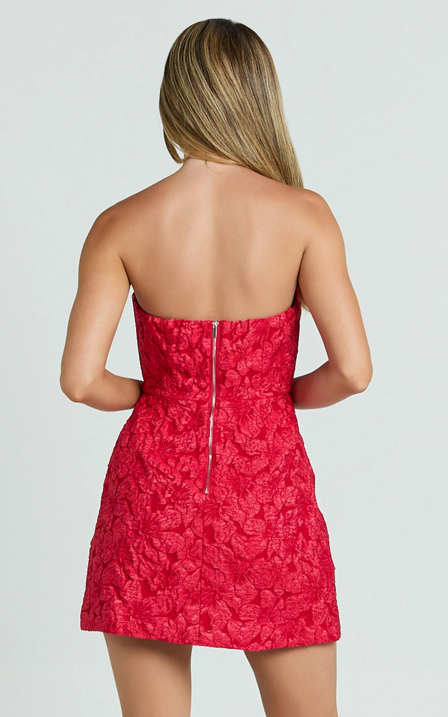 Transform your look with the Brailey Mini Dress - a stunning Strapless Dress in Red Jacquard that promises to be your new go-to for any cocktail event, party day gathering, or dance-the-night-away party night. Perfectly designed for the woman who adores both style and comfort, this dress embodies empowerment and inclusivity, making every wearer feel confident and beautiful.