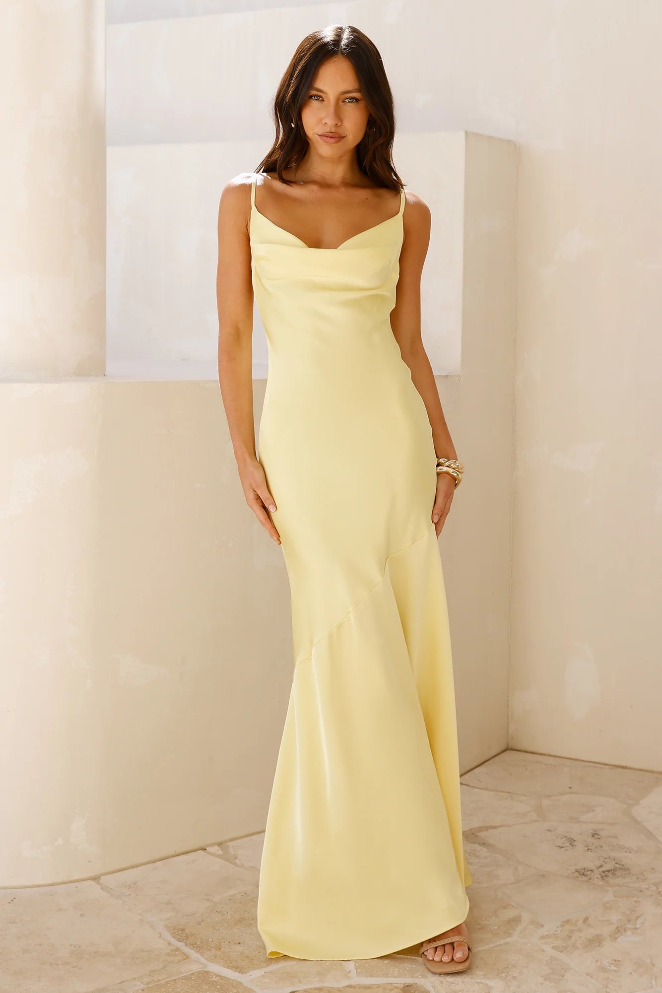 The Brilliant Belle Satin Maxi Dress features a silky satin fabric with a graceful cowl neck and flowy skirt, complemented by an elegant open back. Style it with delicate jewellery and strappy heels for a radiant, sophisticated look.