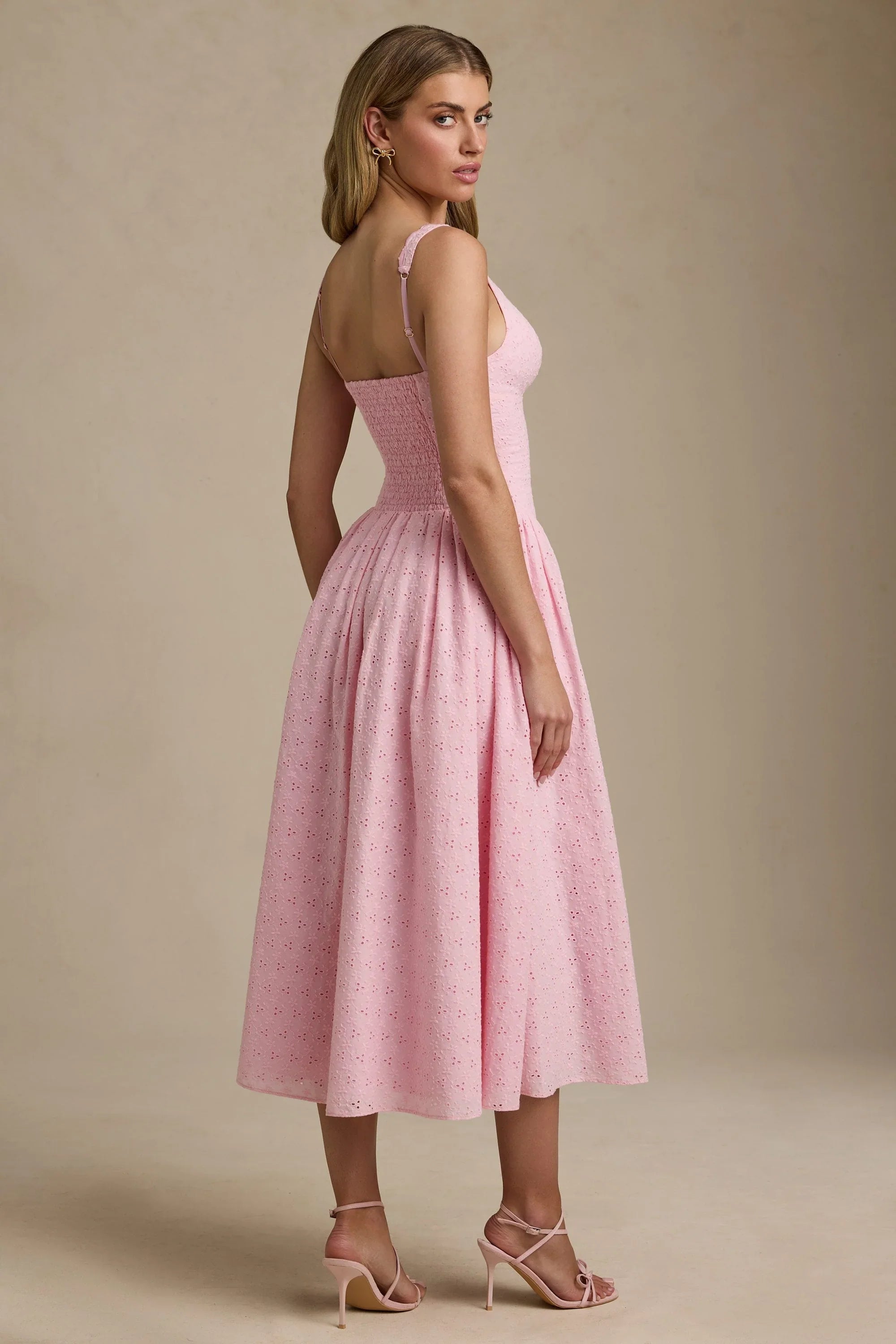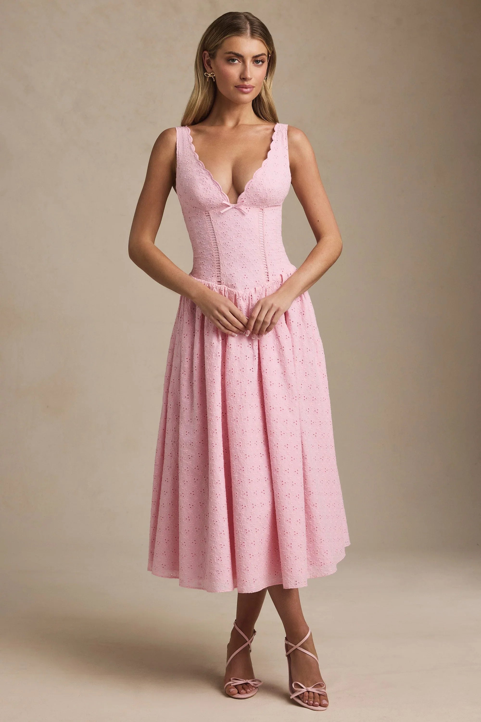 Crisp silhouettes and the prettiest details. A summery style you’ll have on repeat, the Saidey midaxi dress is crafted from cotton broderie anglaise to a figure-enhancing silhouette with a fitted bodice and voluminous skirt underlaid with lightweight tulle. It’s framed with a scalloped V-neckline, features an elasticated shirred panel at the back for a comfortable fit, and is detailed with a delicate tonal bow at the front.