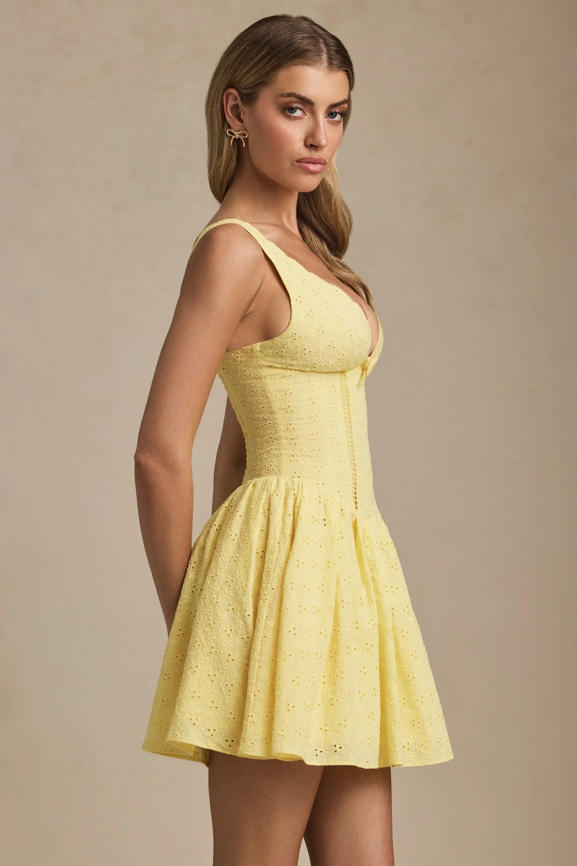 Feminine shape and romantic details, ready for spring days. Crafted from lightweight cotton broderie anglaise, the Sabina mini dress is cut to a universally flattering A-line silhouette with a fitted bodice and voluminous skirt. It’s framed with a V-shaped waist, scalloped plunge neckline and bow detailing at the front. It’s complete with adjustable straps and a shirred elasticated panel at the back for a comfortable fit.