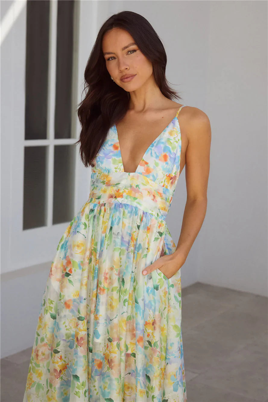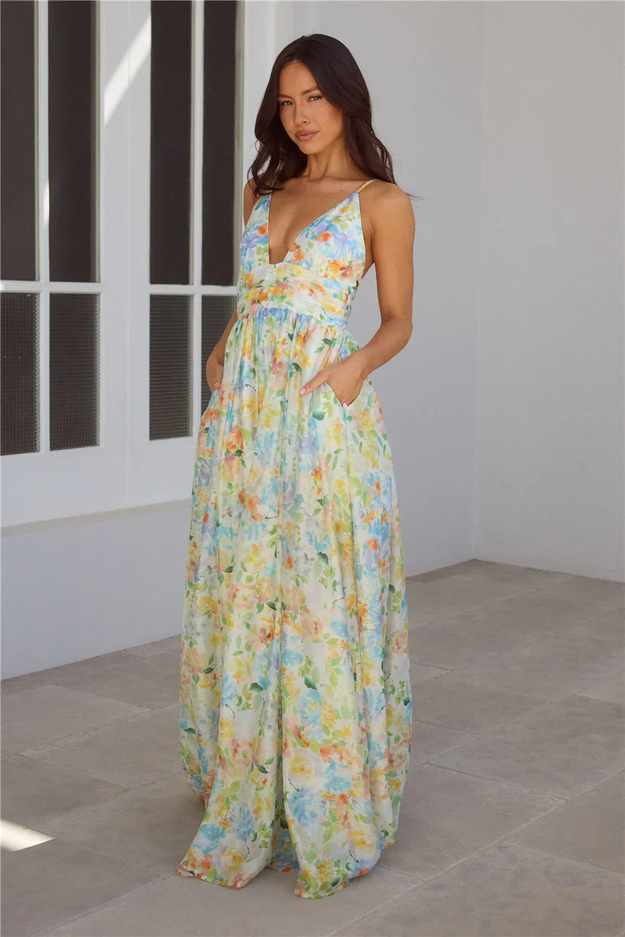 The Buttercup Fields Maxi Dress features a flattering V-neckline and a flowy skirt that moves beautifully with every step. A pleated waist adds a touch of shape and charm, making it the perfect pick for sun-filled days or dreamy afternoons. Style with heels.