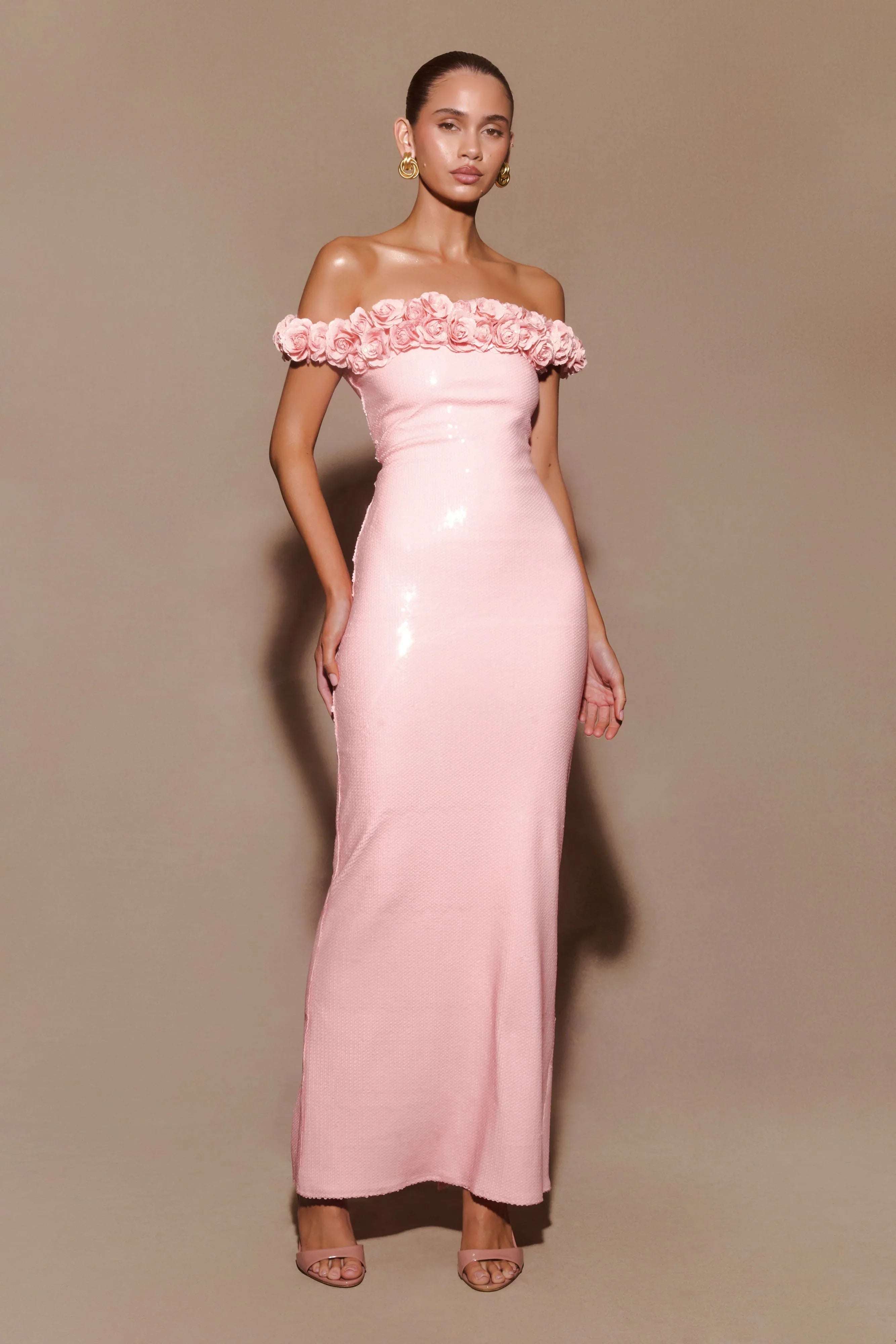 The CARRIE Sequin Rose Maxi Dress combines romantic elegance with dazzling glamour. Featuring an off-the-shoulder neckline adorned with a stunning rose detail, this dress makes an unforgettable statement. The fitted silhouette hugs your curves, while the shimmering sequin fabrication catches the light beautifully. Designed in a maxi length with a back skirt vent for graceful movement, it’s lined for comfort and finished with a centre back zip for easy wear. Perfect for formal occasions, this dress brings a touch of timeless beauty to any event.