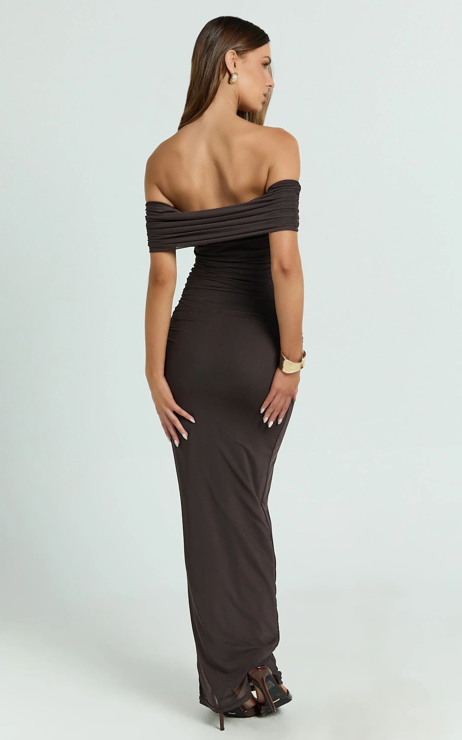 This off-shoulder ruched Dresses moment hugs in all the right places with a body-skimming mesh finish and a floor-sweeping silhouette made for date nights, cocktails, and every after-dark invite. The neckline sits just-so to frame your collarbones, while the all-over ruching sculpts and flatters from every angle, hello, confidence. Think sultry yet polished, with a rich brown tone that taps into evening glamour and is trending hard right now.