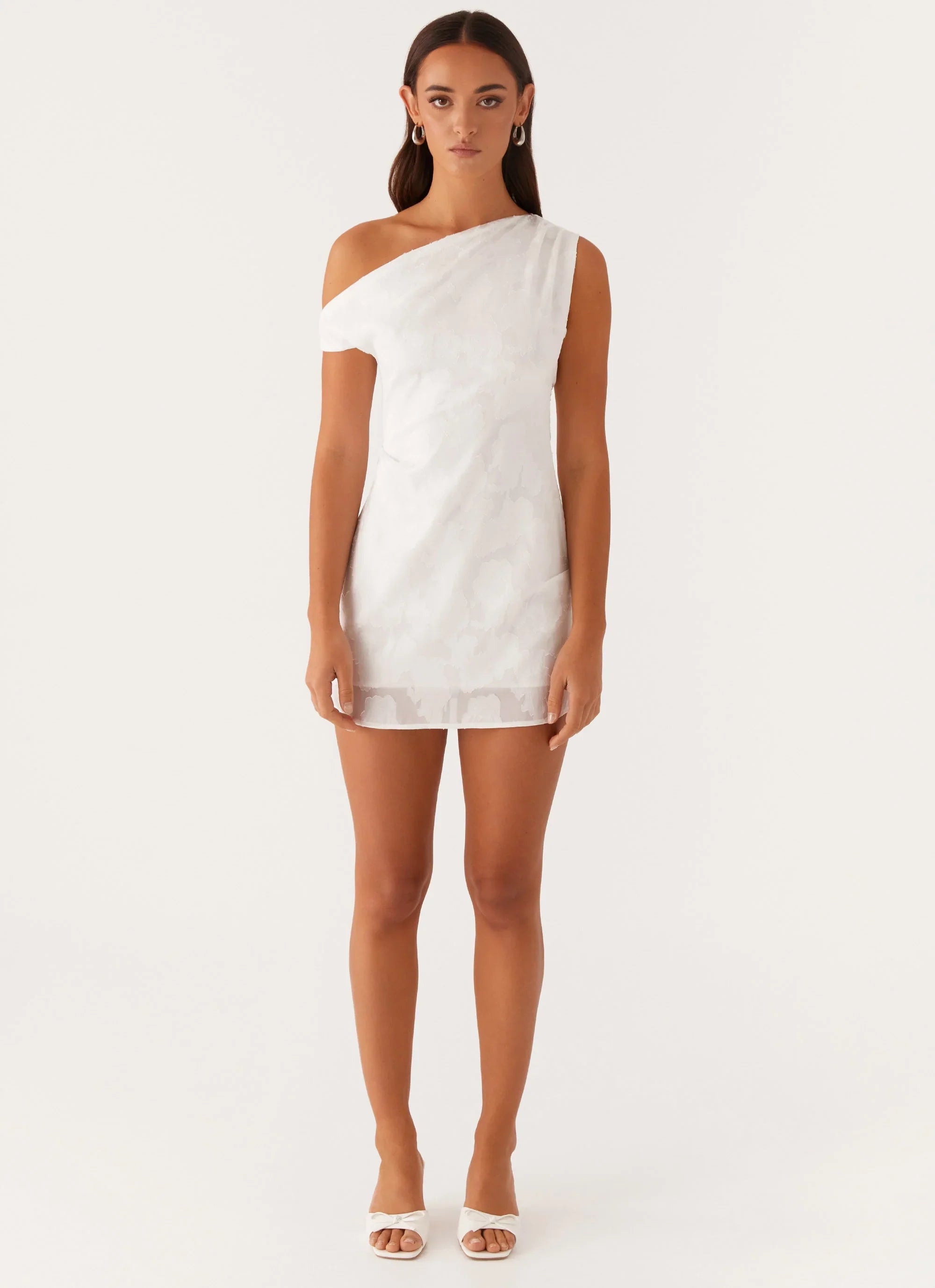 Elevate your evening style with the Channing One Shoulder Mini Dress. Designed with a chic off-shoulder neckline and delicate ruched shoulder seam, this jacquard piece effortlessly combines sophistication with a touch of edge.