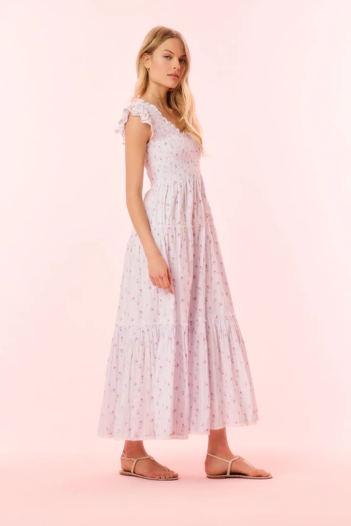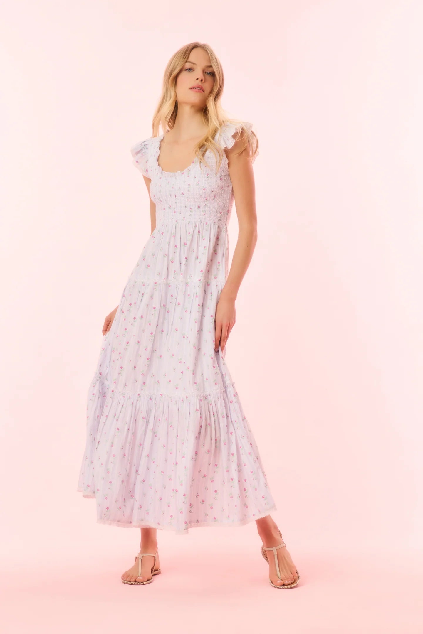 Our Chessie Dress returns with a striped cotton voile fabric featuring a ditsy floral print all over. Featured in a floral-printed, ultra-soft cotton, this airy dress is perfect for a date night or soaking up the sunshine. Ruffle sleeves flutter at the shoulders that merge around the scoop neck. The fitted smocked bodice flounces into a dreamy midi skirt decorated with custom lace insets.