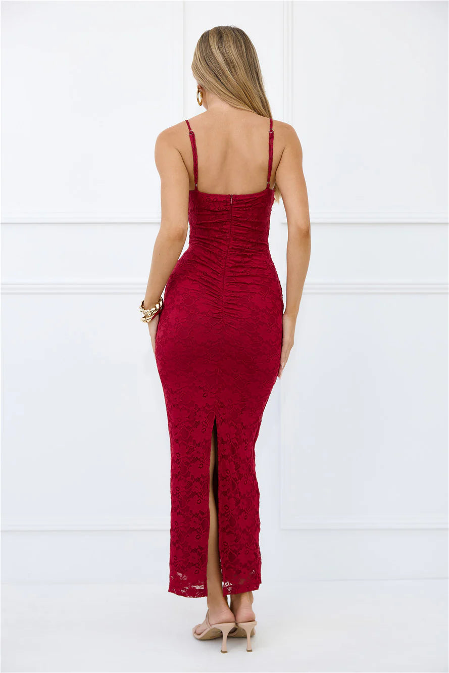 The Chic After Dark Lace Maxi Dress features a delicate lace design with a sheer bodice that creates an alluring vibe. The twist detail adds a touch of sophistication, making it the ideal dress for an evening that demands attention and elegance. Style with heels.