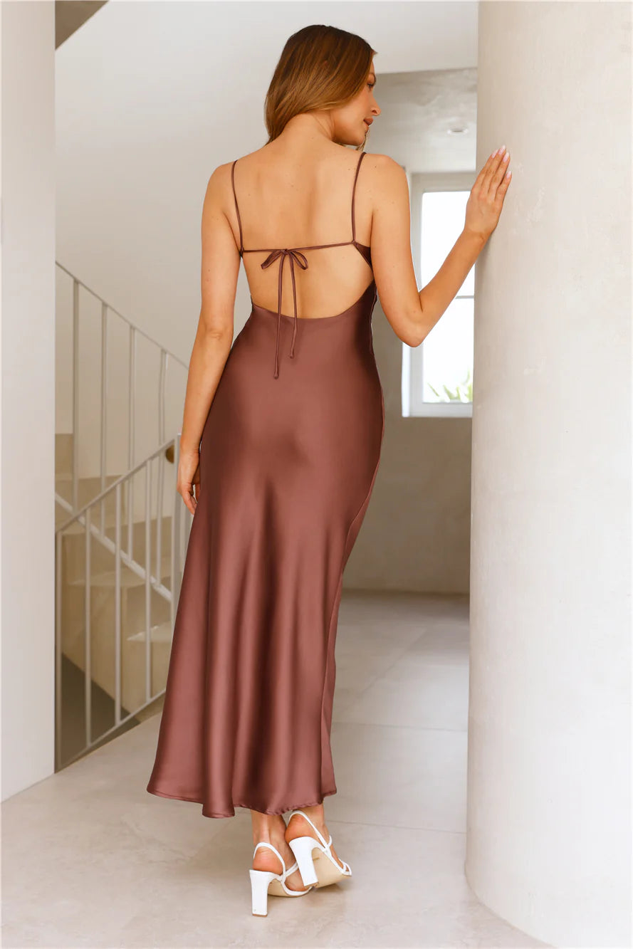 Lovely, this style is classy and sophisticated. The Chic 'Fit Slip Satin Maxi Dress features a gorgeous silky silhouette and an open back with a tie detail. Style with heels to turn heads in the best way possible.