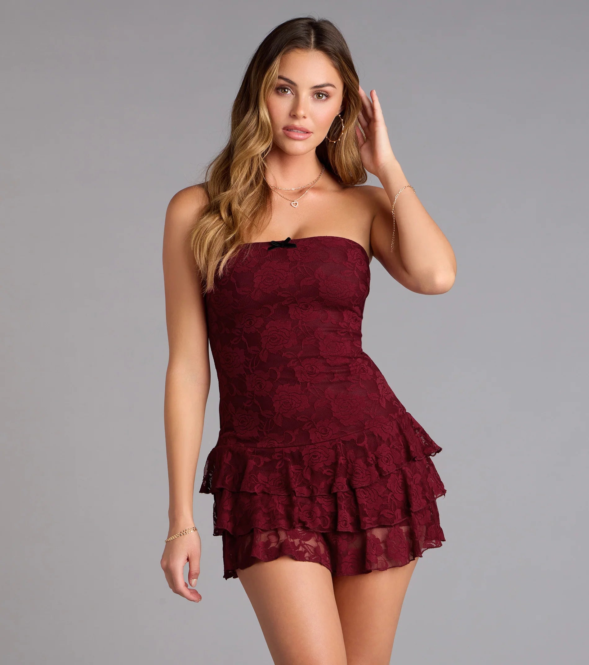 Romance is in full bloom with this lace ruffle mini that’s equal parts sweet and sultry. Strapless with a form-hugging fit, it’s made for date nights, parties, and those moments you want to own the room.