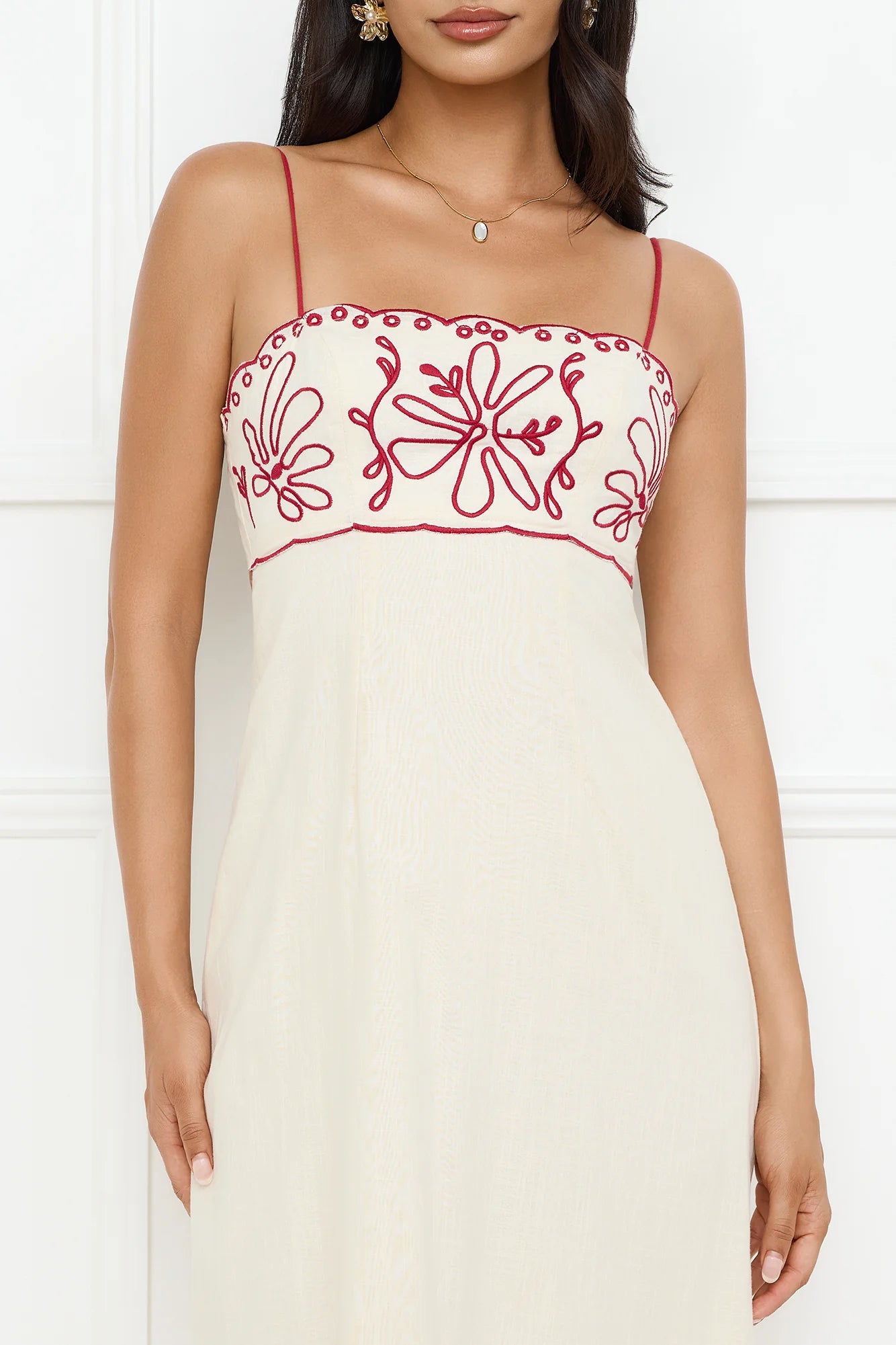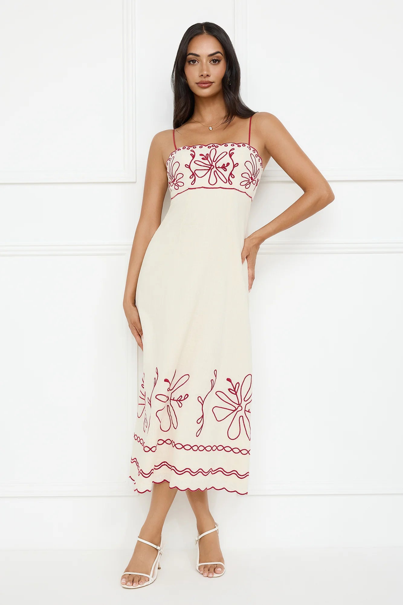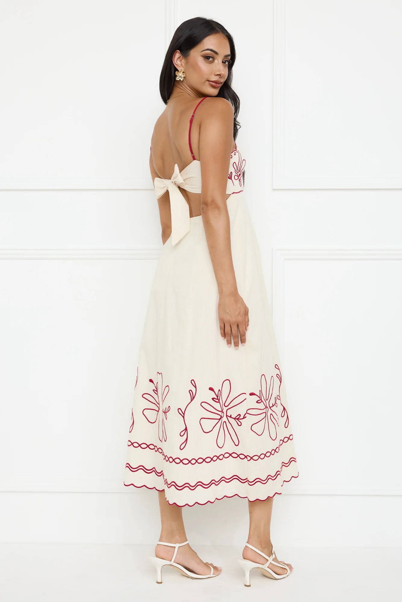 The Daylight Dreamer Midi Dress features a tie-up back, a flowy skirt, and a beautifully embroidered design, perfect for a soft, beachy vibe. Style with sandals for a 'fit we love.