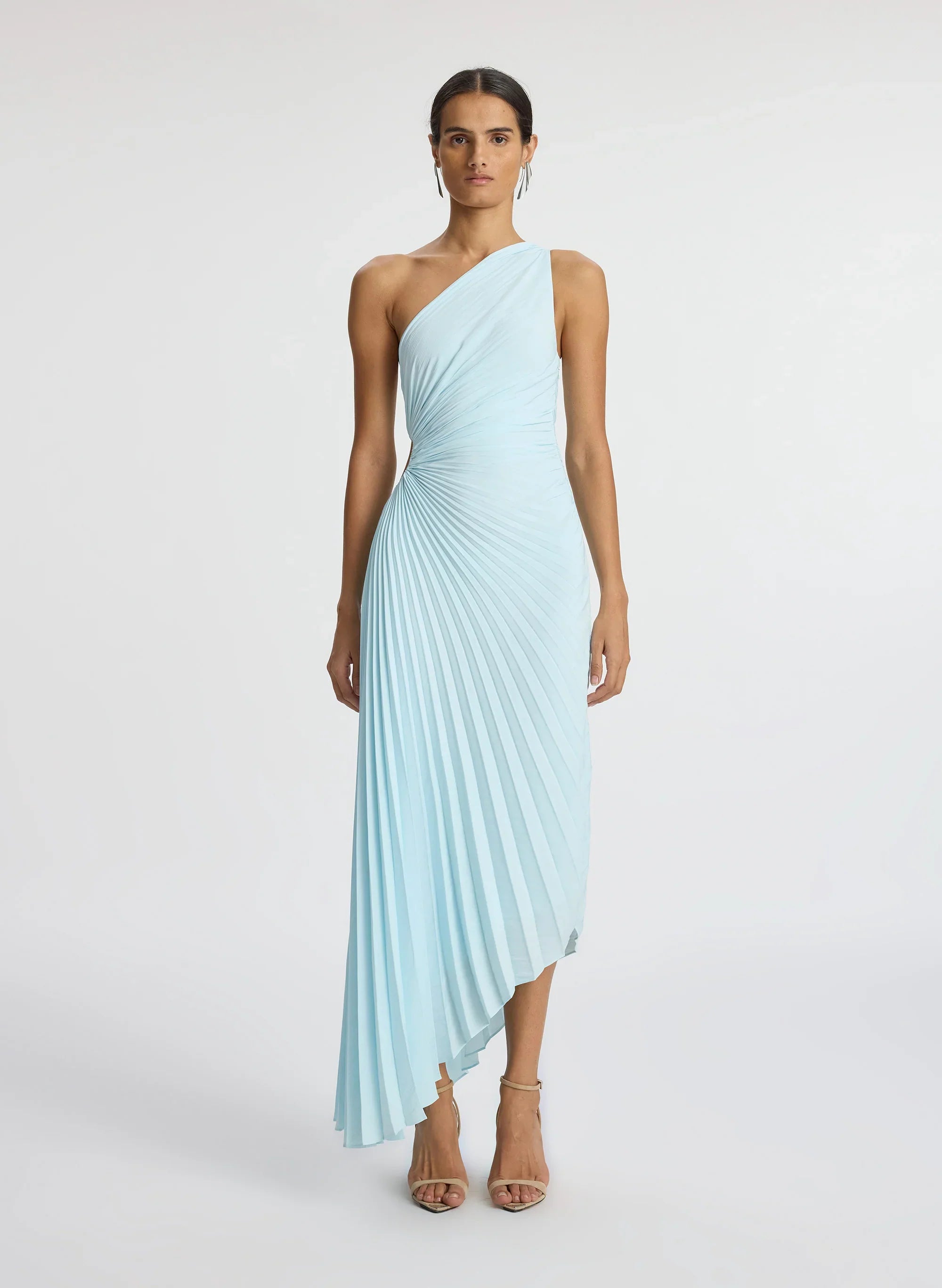 The Delfina Dress. a part of A.L.C.'s Signature Collection. is asymmetrically draped and pleated from our signature matte fabric in an aqua-blue hue. This one-shoulder silhouette features a confident side cutout and high-low hem. This style runs true to size. Shop Dresses