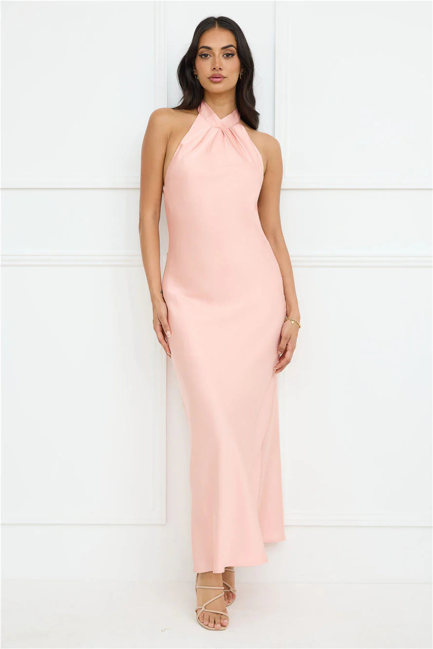 The attention was made for you. Be seen in the Delicate Dazzle Halter Satin Maxi Dress for your fancy event. It features a silky satin silhouette, a halter tie and an open back. Style with heels and curls.