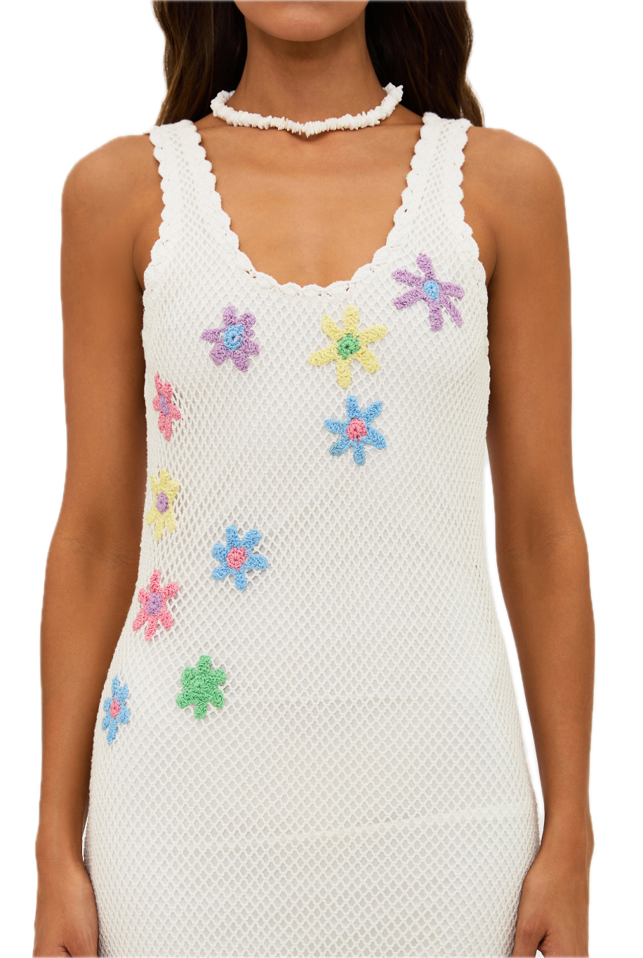 Crochet Dress with flowers, scalloped neckline and low back. Mini Slip underneath