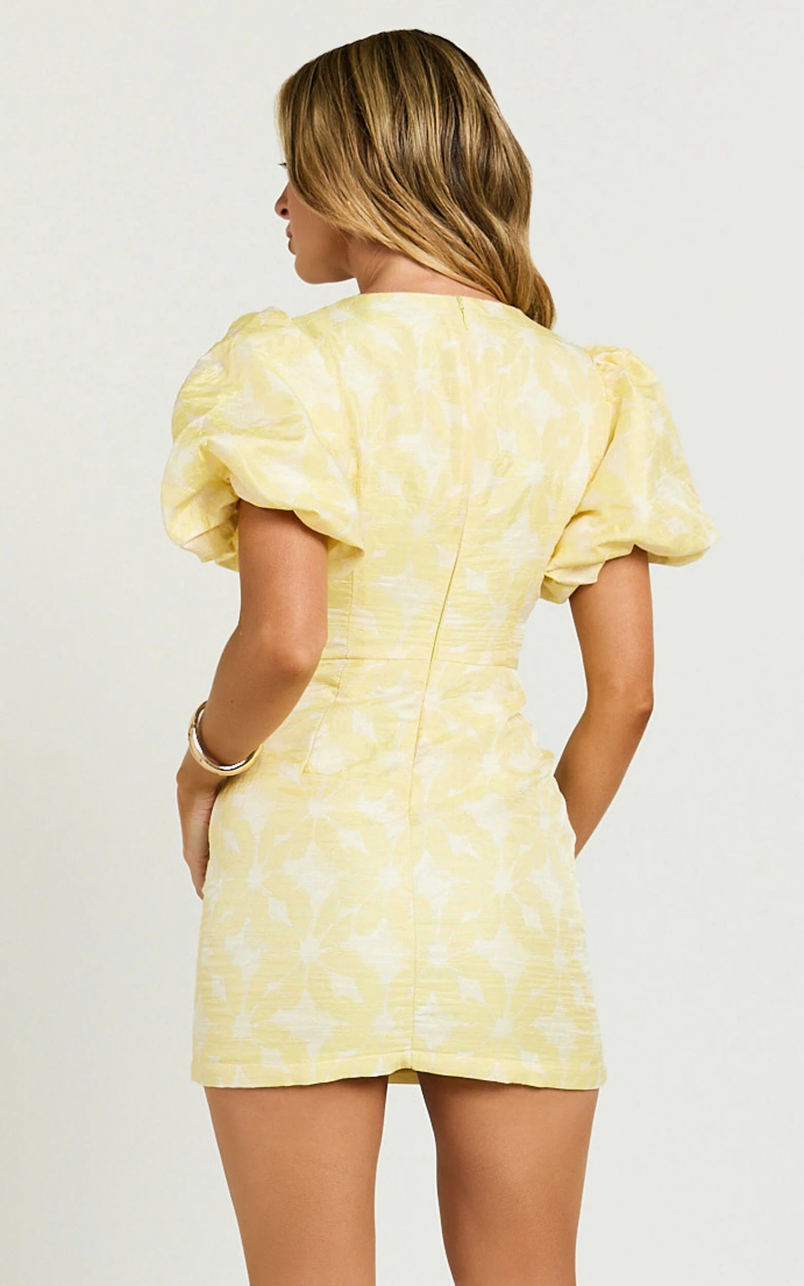 Transform your look with the Diana Mini Dress - your next wardrobe essential that's as bold as you are. This Jacquard Short Sleeve Cut Out Dress in a vibrant Lemon shade isn't just a dress; it's a statement. Designed for the daring and crafted for the confident, this dress is a celebration of you.