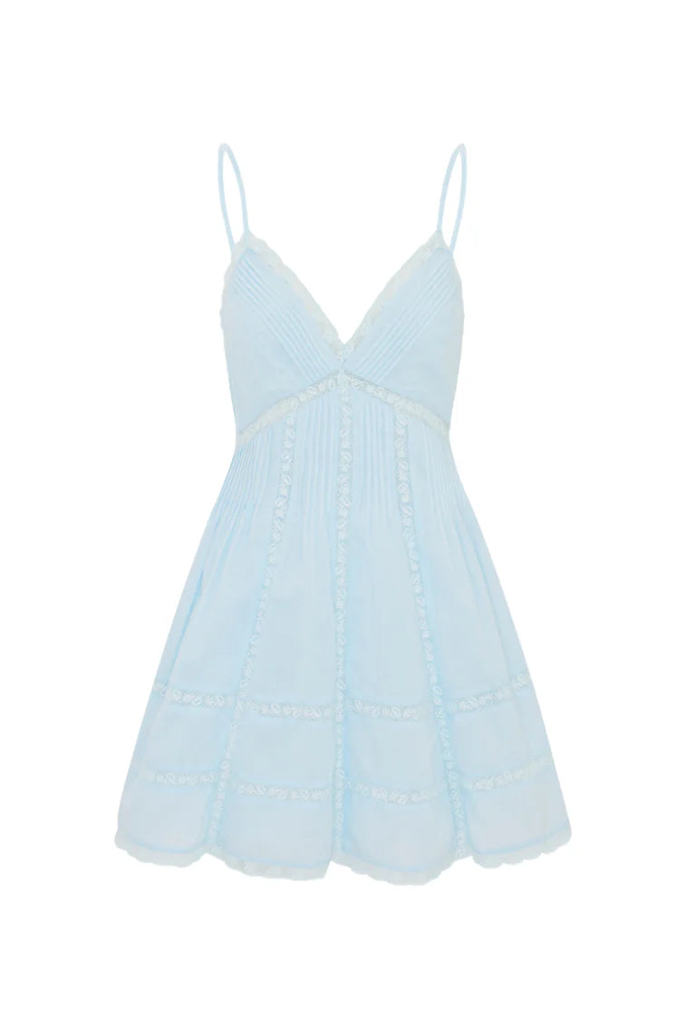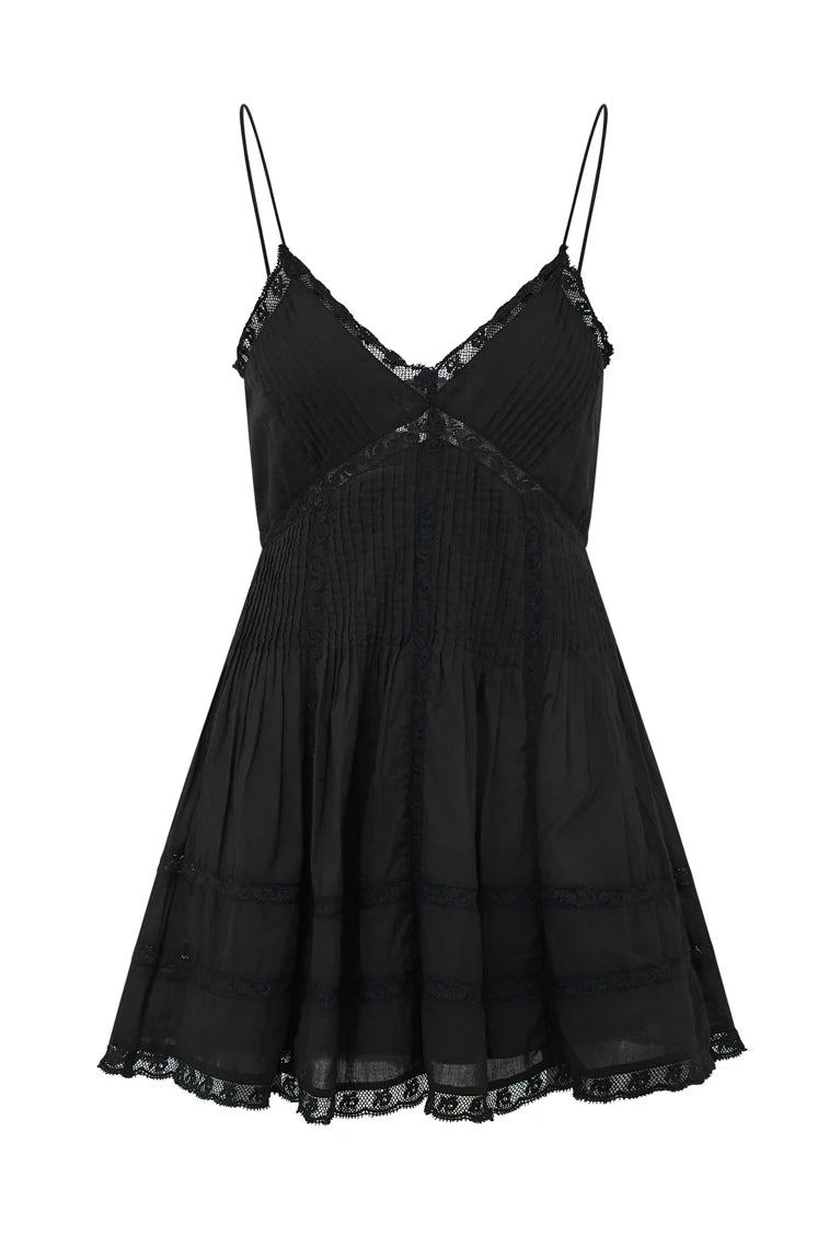 Our Docila Dress is a flirty mini designed with a flattering silhouette with lace insets and pintucking details. The dress features a smocked back, spaghetti straps, and an airy skirt finished with lace.