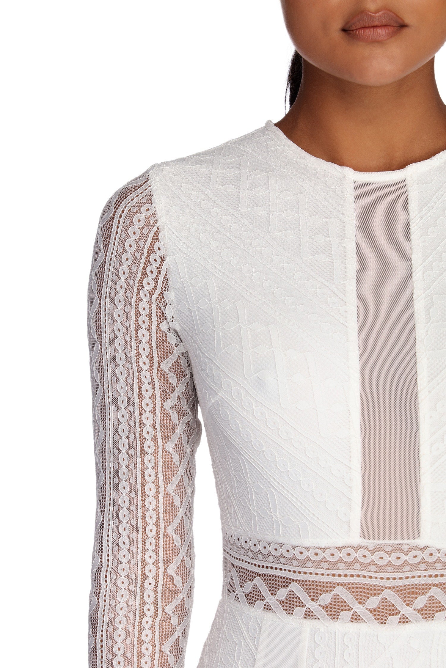 Show off your pretty in this dreamy lace mini dress! It features a high round neckline, long fitted sheer sleeves, an exposed back gold zipper and hook and eye closure, a sheer lace back, a sheer mesh vertical cut out and lace waist cut out, and a short, fitted skirt with a knit lining. The ivory dress is composed of a lace and mesh fabric with plenty of stretch.