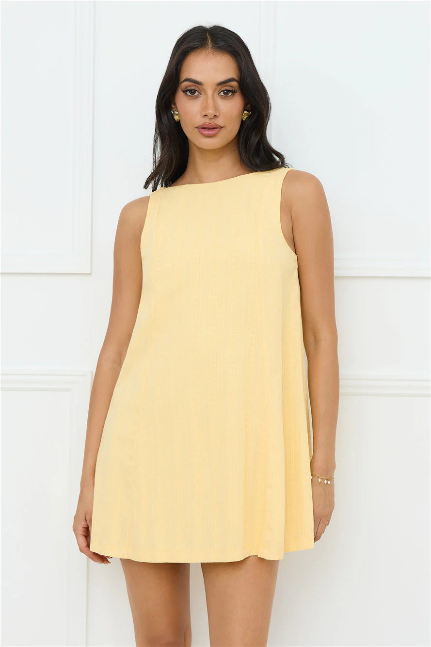 The Effortless Icon Mini Dress features a textured pattern, a flowy fit, and a flattering V-back design, perfect for a relaxed yet stylish vibe. Style with sandals all summer.