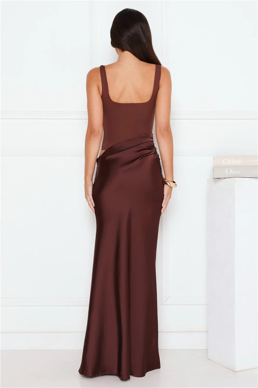The Effortlessly Yours Satin Maxi Dress features a stretch bodysuit-style top with convenient snap closures, a flowing satin skirt and a slit to the waist. Style with heels.