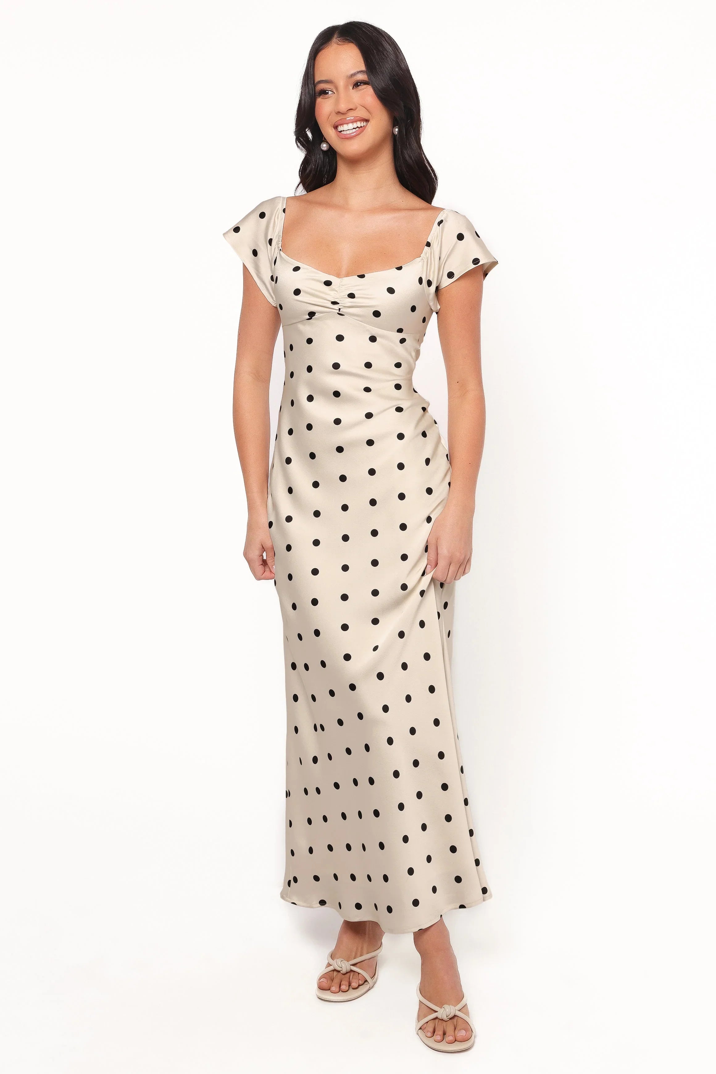 | DETAILS This stunning maxi dress cascades gracefully to a full length, offering an elegant silhouette that flatters every figure. With its round neckline and short cap sleeves, it's the epitome of modern chic, while the soft satin feel adds a touch of luxury to your ensemble.