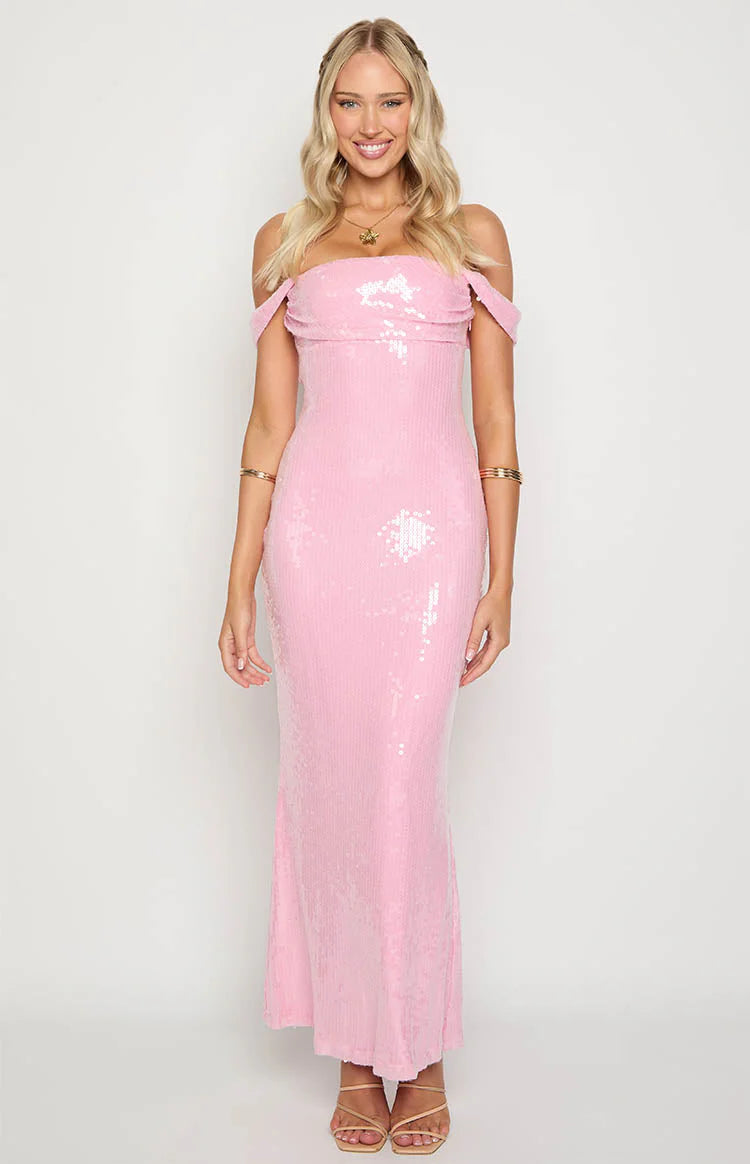 Pink Sequin Off Shoulder Formal Maxi Dress