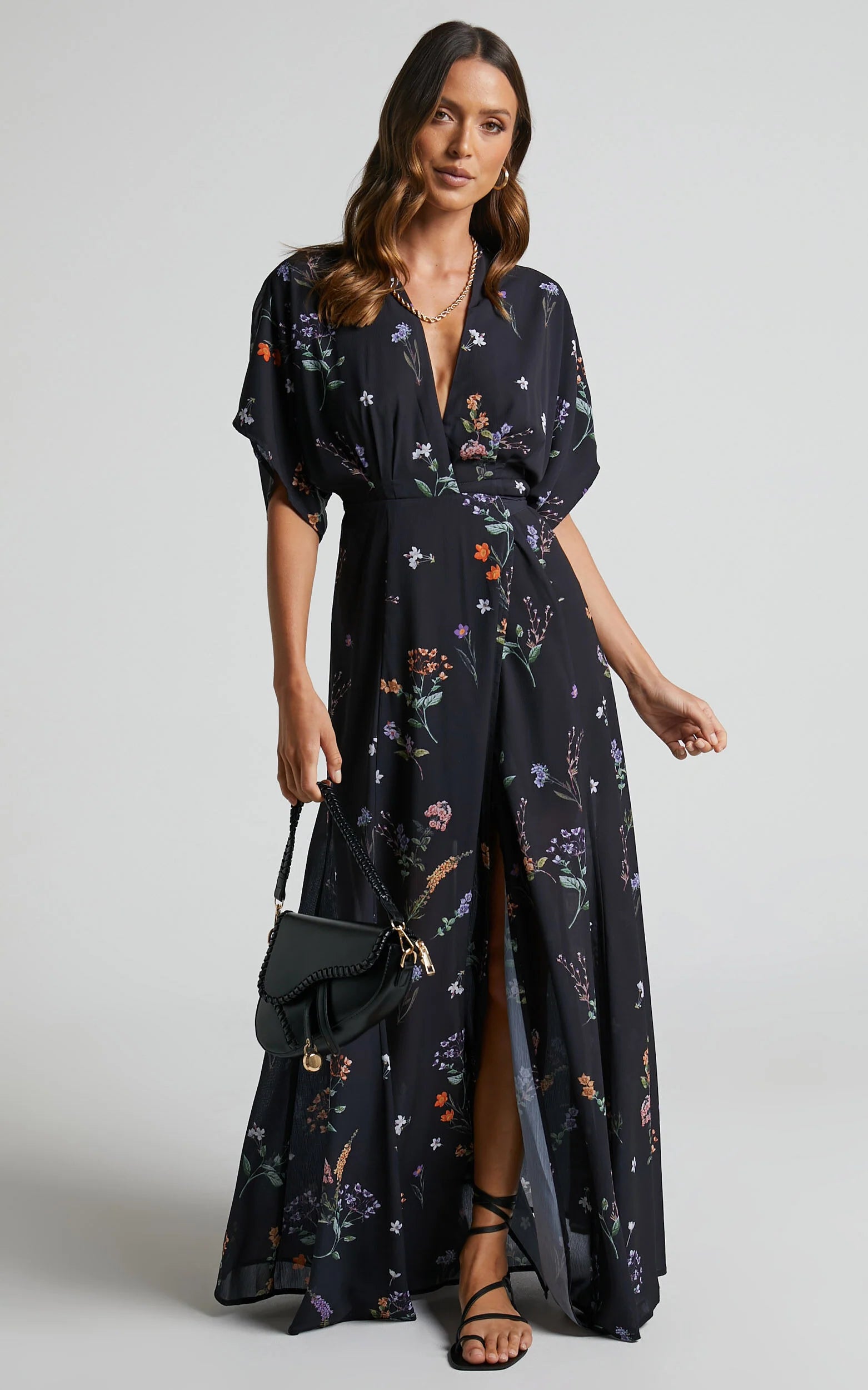 Get ready to make a bold statement with our Erenza Midaxi Dress in Black Flower Field. This extended sleeve wrap dress is perfect for any occasion, whether it's a casual day out or a springtime soiree. Made from high-quality polyester, this dress offers both comfort and style. The V neck adds a touch of sophistication, while the midi length keeps things classy yet trendy. With its short sleeves and flattering wrap design, this dress will have you feeling empowered and ready to conquer anything that comes your way. So go ahead and embrace your inner fashionista with our Erenza Midaxi Dress - because every girl deserves to look fabulous!Product Details:Wrap style midi dressV-neckline and short sleevesMade from polyester fabricCasual spring dressSize and FitSize S / 8 length: 146cm / 57.48inStudio model is wearing size XS / 6 AU / 2 US / 6 UK / 34 EUStudio model measurements are:Height: 170cm / 5'7''Bust: 84cm / 33''Waist: 61cm / 24''Hip: 88cm / 35''Studio model is wearing size XXXL / 18 AU / 14 US / 18 UK / 46 EUStudio model measurements are:Height: 172cm / 5'8''Bust: 111cm / 44''Waist: 91cm / 36''Hip: 129cm / 51''Material and CareMain Fabric: 100% PolyesterLow / No stretch