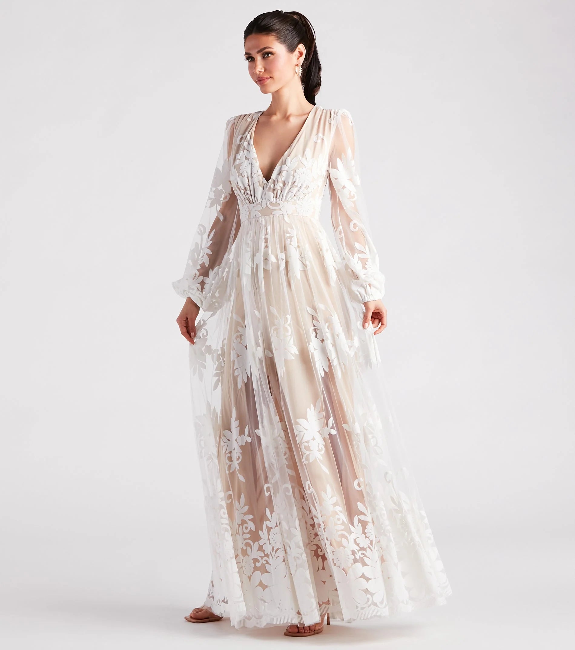 A floral flocked velvet design brings drama and sophistication to the Evelyn formal dress perfect for leaving an impression at HOCO or winter formal! She features elegant peasant long sleeves, a plunge v-neckline, empire waistband atop her flowy, a-line silhouette leading to the floor-sweeping hem. The formal dress is composed of sheer tulle fabric with knit lining with dual slits. Complete your dressy look in a dainty lariat necklace.