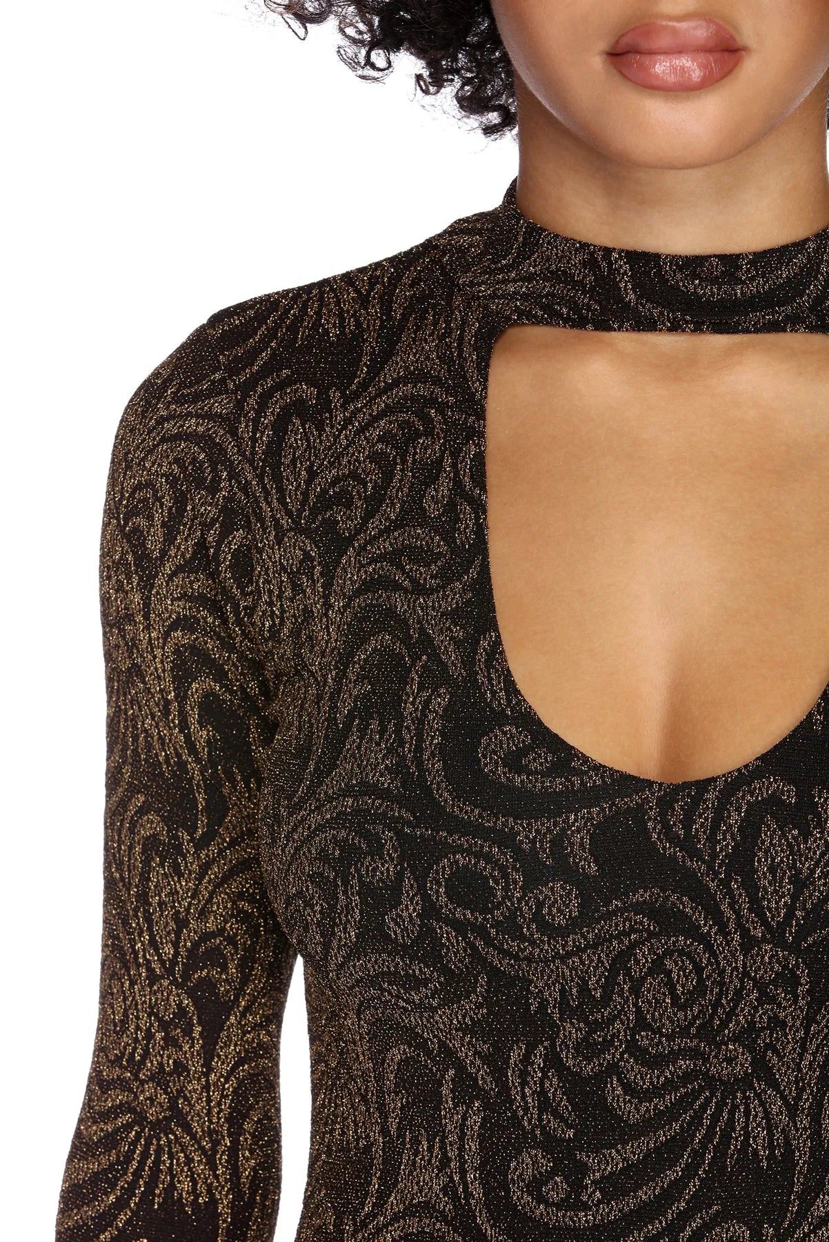 Model is 5'9" with a 34 bust, 24 waist and 34.5" hips. She is wearing a size small.