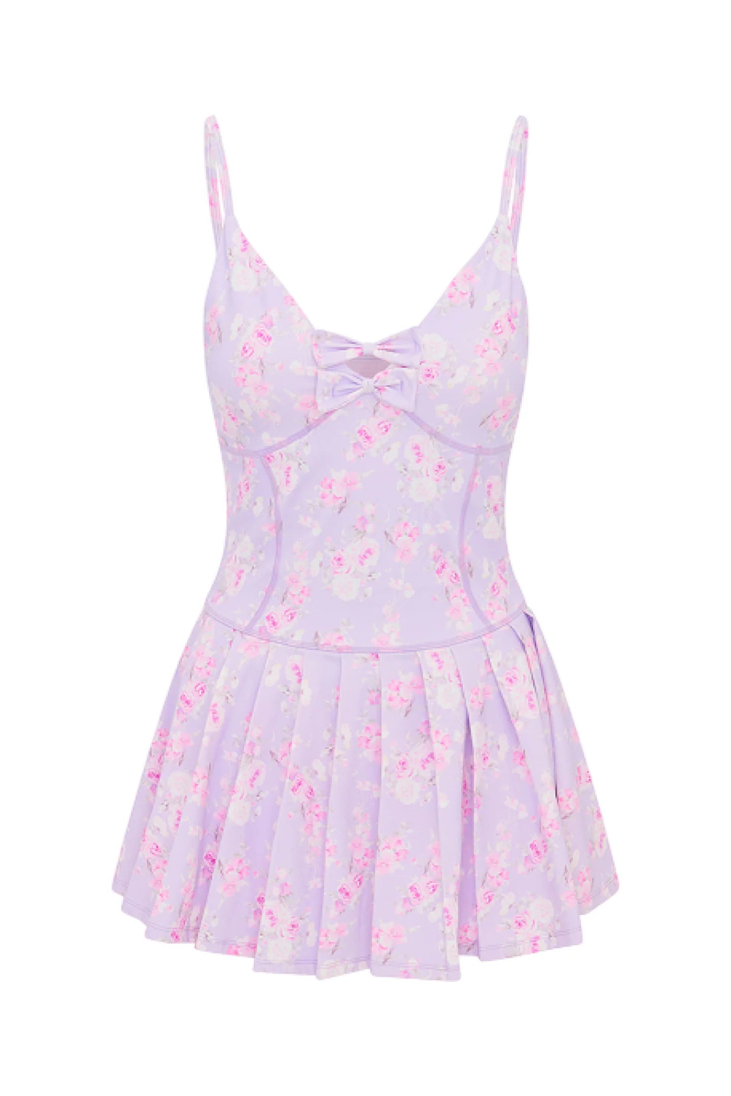 Game, set, mini. The Hubert Dress returns in our signature floral prints. Designed with a lightweight, breathable fabric, this active dress features built-in shorts for functionality, bra cups at the bust, functional pockets, princess and a center front seam. This sporty mini has thin spaghetti straps, a bow detail at center front, and an airy ruffle skirt.