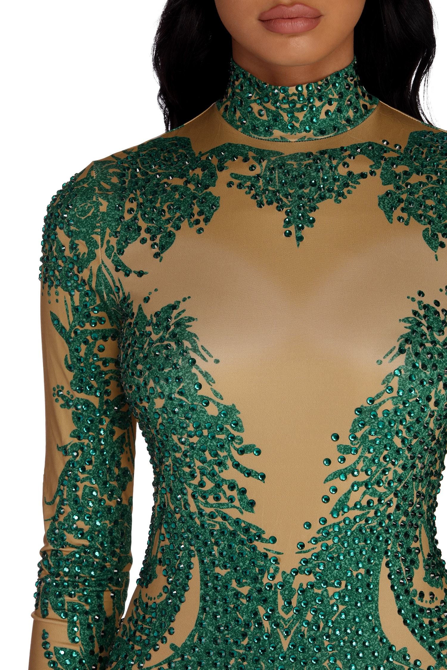 Turn up the heat on your next evening in our dazzling Julian dress! She features a mock neck, fitted long sleeves and a playful mini length silhouette. She features an all over lined natural hue adorned with green foliage and sparkling heatstones. Dress is composed of smooth knit fabric that offers a form hugging fit with a slight stretch. Includes a back zipper closure.