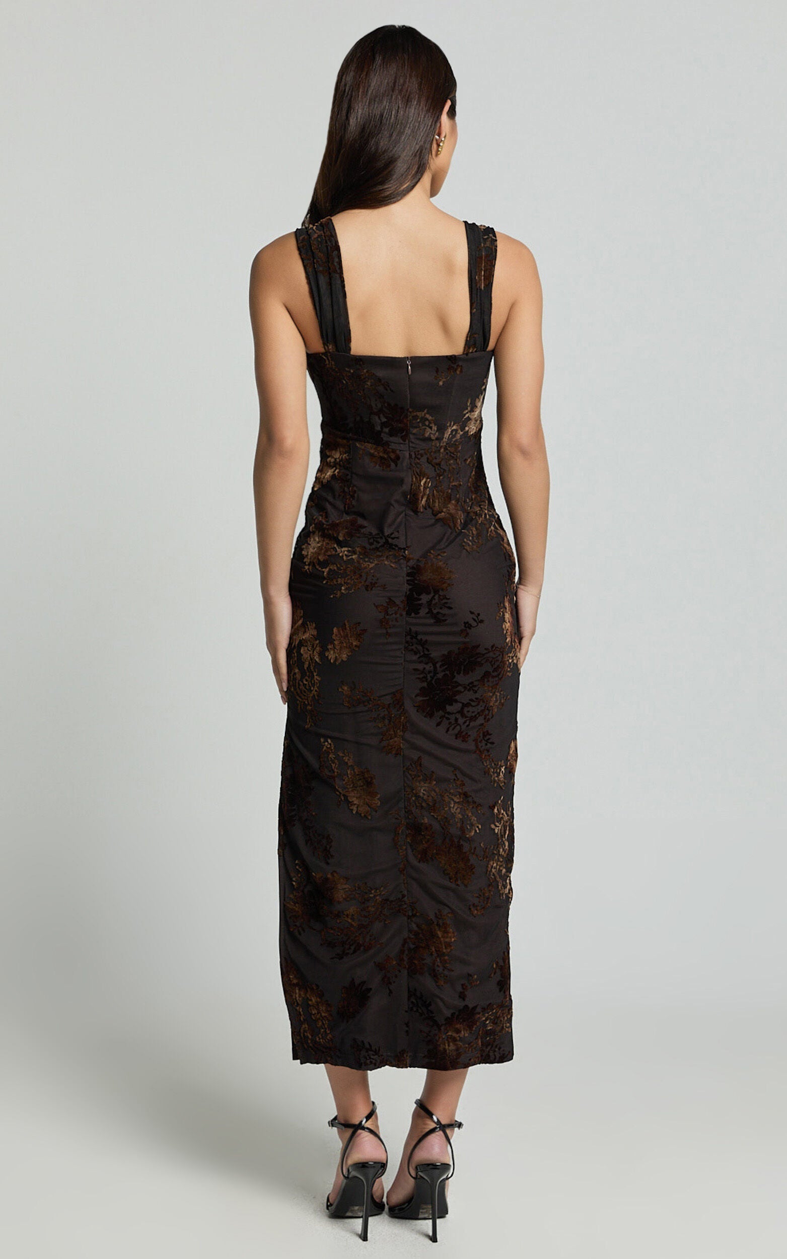 Get ready to turn heads in the Karlene Midi Dress, a stunning piece where sophistication meets modern flair. This ruched corset burnout dress, available in an eye-catching black and brown palette, is designed to embrace and empower your every curve. Crafted from quality polyester, it promises both comfort and style, making it a must-have in your wardrobe.Product Details:Inner LiningZip ClosureBodycon FitBurnout PolyesterScoop NecklineParty PerfectMidi LengthSleevelessSize and FitSize S / 8 length: 116cm / 45.67inMaterial and CareMain Fabric: 100% Polyester Lining: 92% Polyester, 8% SpandexLow Stretch