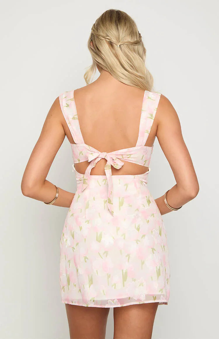 Our Layla Pink Floral Tie Back Mini Dress is the perfect sweet and playful choice for brunch dates or day events! Crafted from delicate chiffon with tuck detailing on the bust, this mini features removable ribbon bows and a self-tie back for a charming, adjustable fit. Style with delicate jewellery and heels for an effortlessly romantic look!