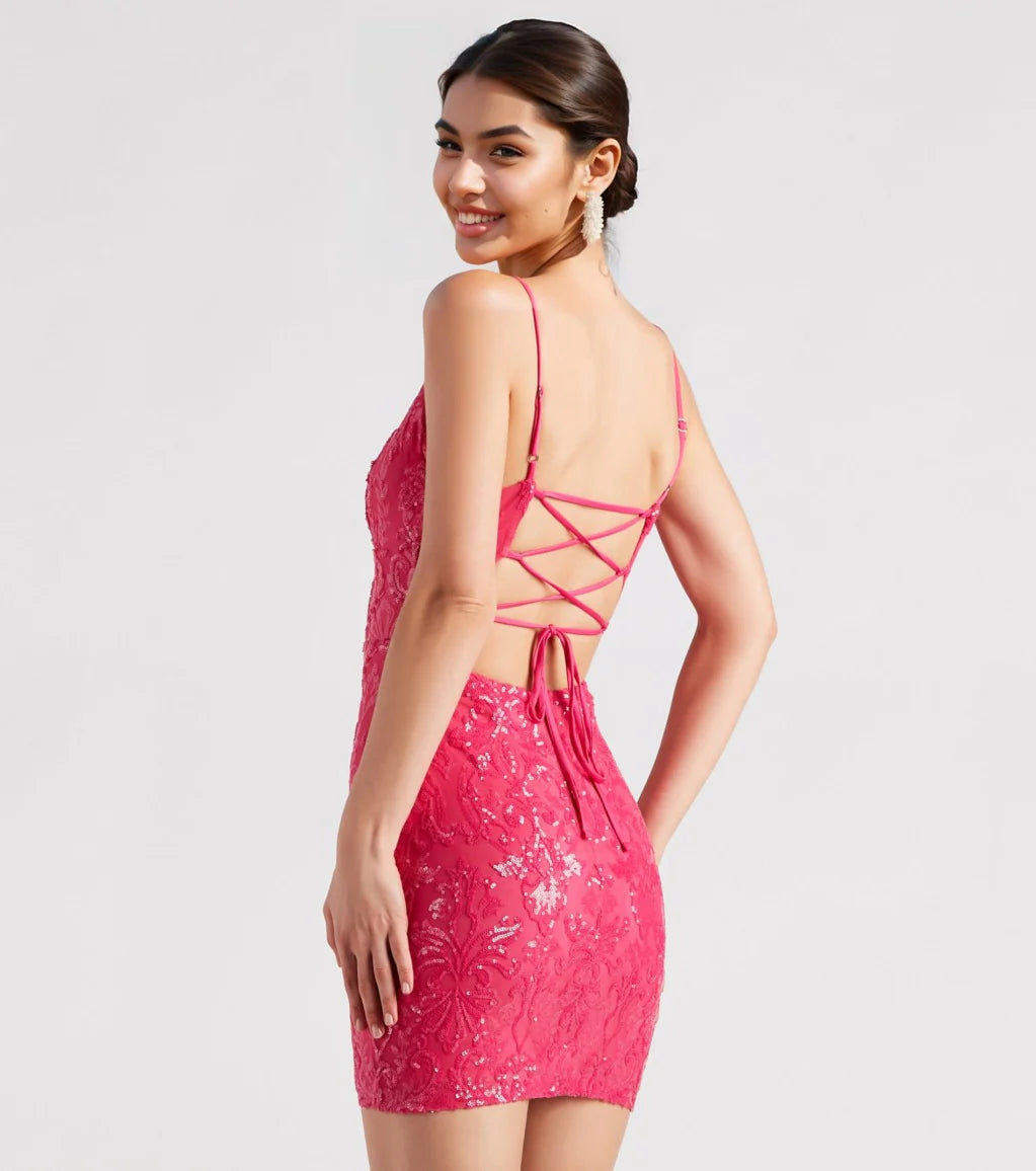 Shine bright and sparkle up the night in the gorgeous Leila mini dress. She features a sleeveless square neckline, adjustable spaghetti straps, an alluring open back with a lace-up strappy design for a customized fit, and a short, curve-hugging silhouette. The lined mesh fabric features sequin embroidery in a chic scroll pattern. Style this dress with gemstone earrings.