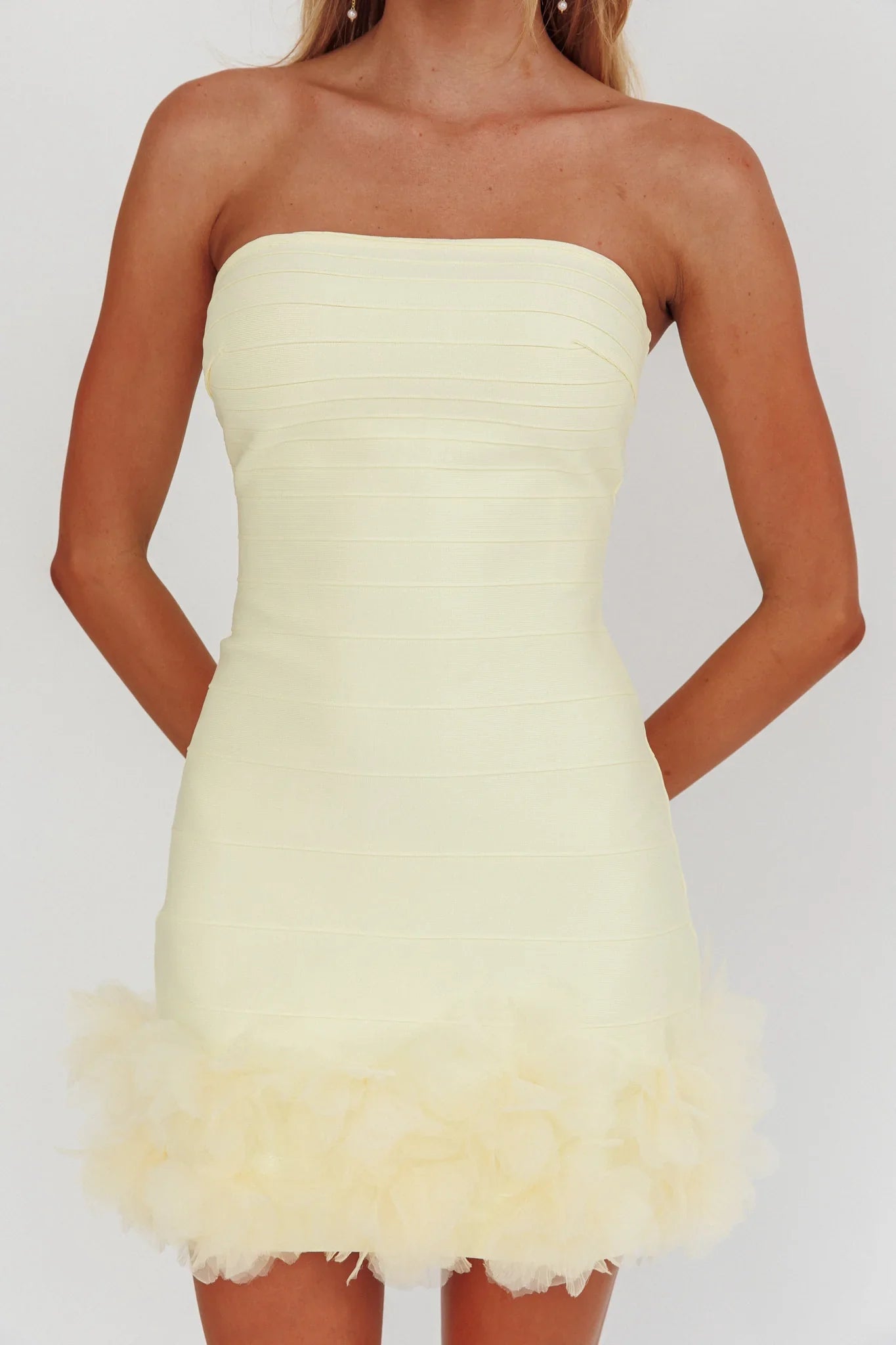 You'll feel like you've just stepped off the red carpet in our Leni mini dress. Its bodycon style hugs your curves and we are in love with the feminine floral embellishment in the hem. Wear it to a wedding or special event for a head-turning look.