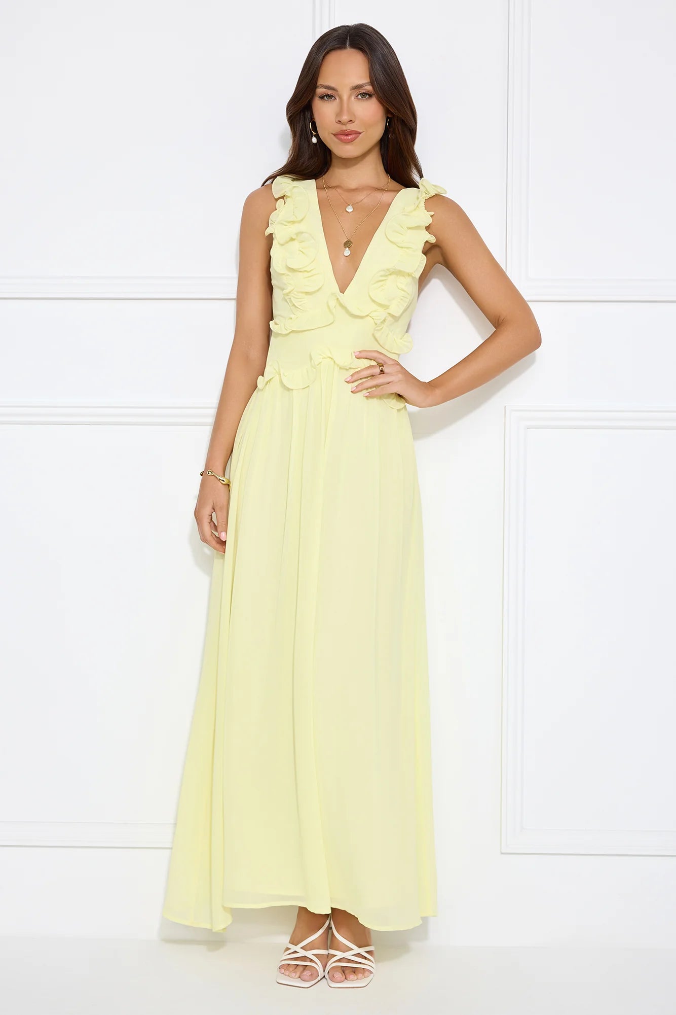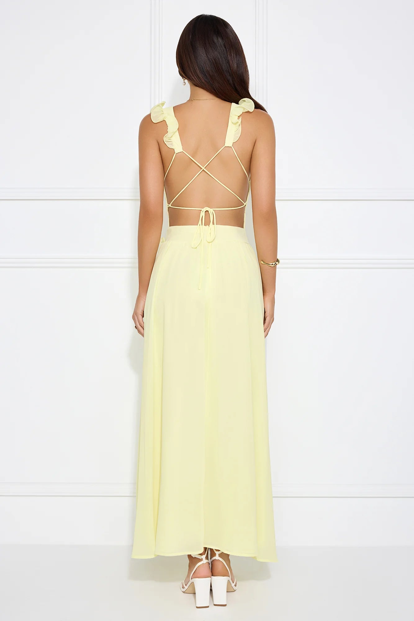 The Light Embrace Maxi Dress features delicate frill details and an open crisscross back for a flirty yet elegant look. Its flowing design adds a touch of softness, making it the perfect choice for a bright, sunny day or evening event. Style with heels.