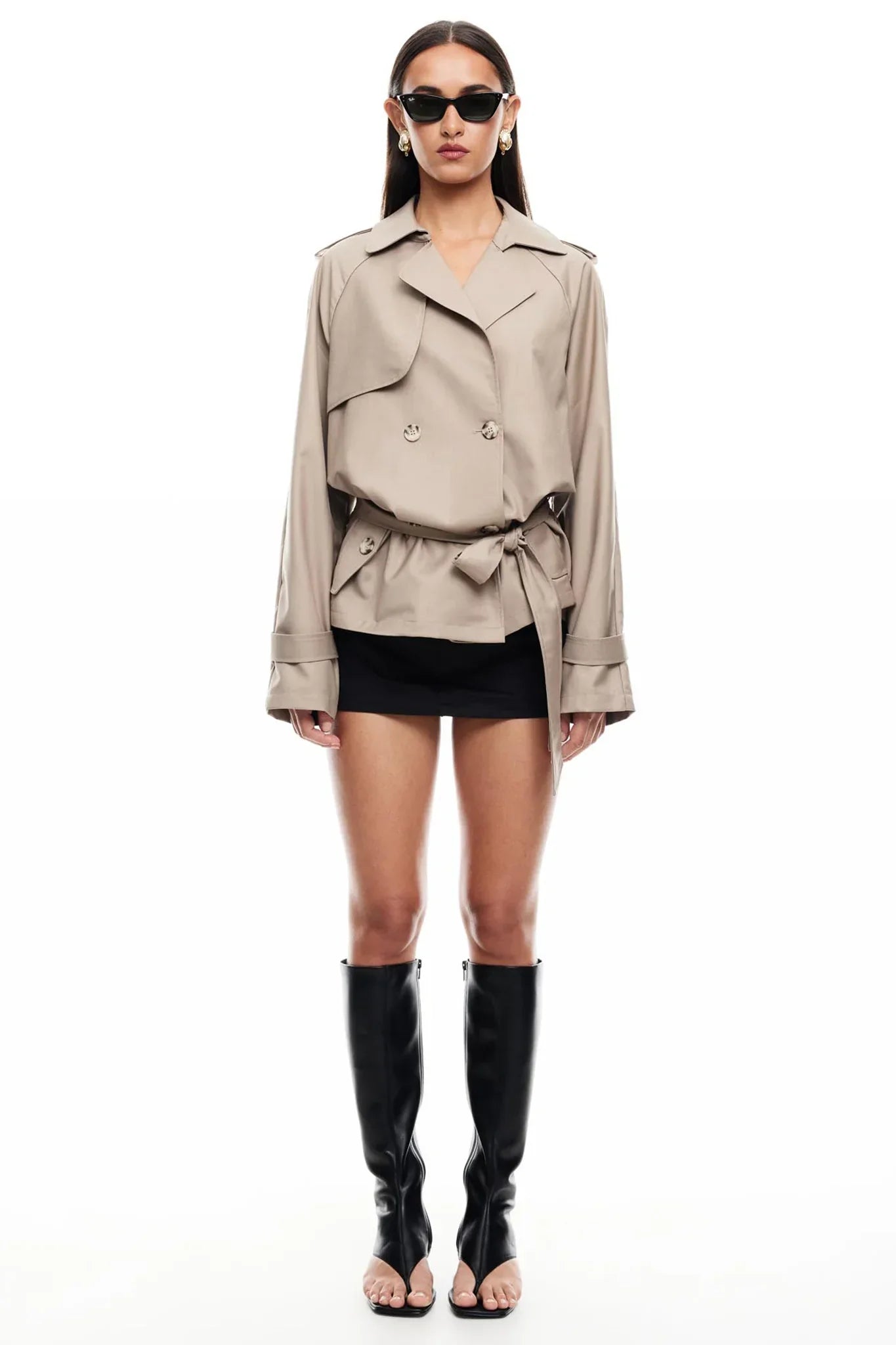 Step into timeless sophistication with the Cropped Trencherous Coat by LIONESS. It's a wardrobe staple that effortlessly combines classic style with contemporary elegance. The epitome of versatility, it seamlessly transitions from day to night, offering both style and functionality for any occasion. Whether you're running errands in the city or exploring the countryside, this coat provides the perfect layer of warmth and style.