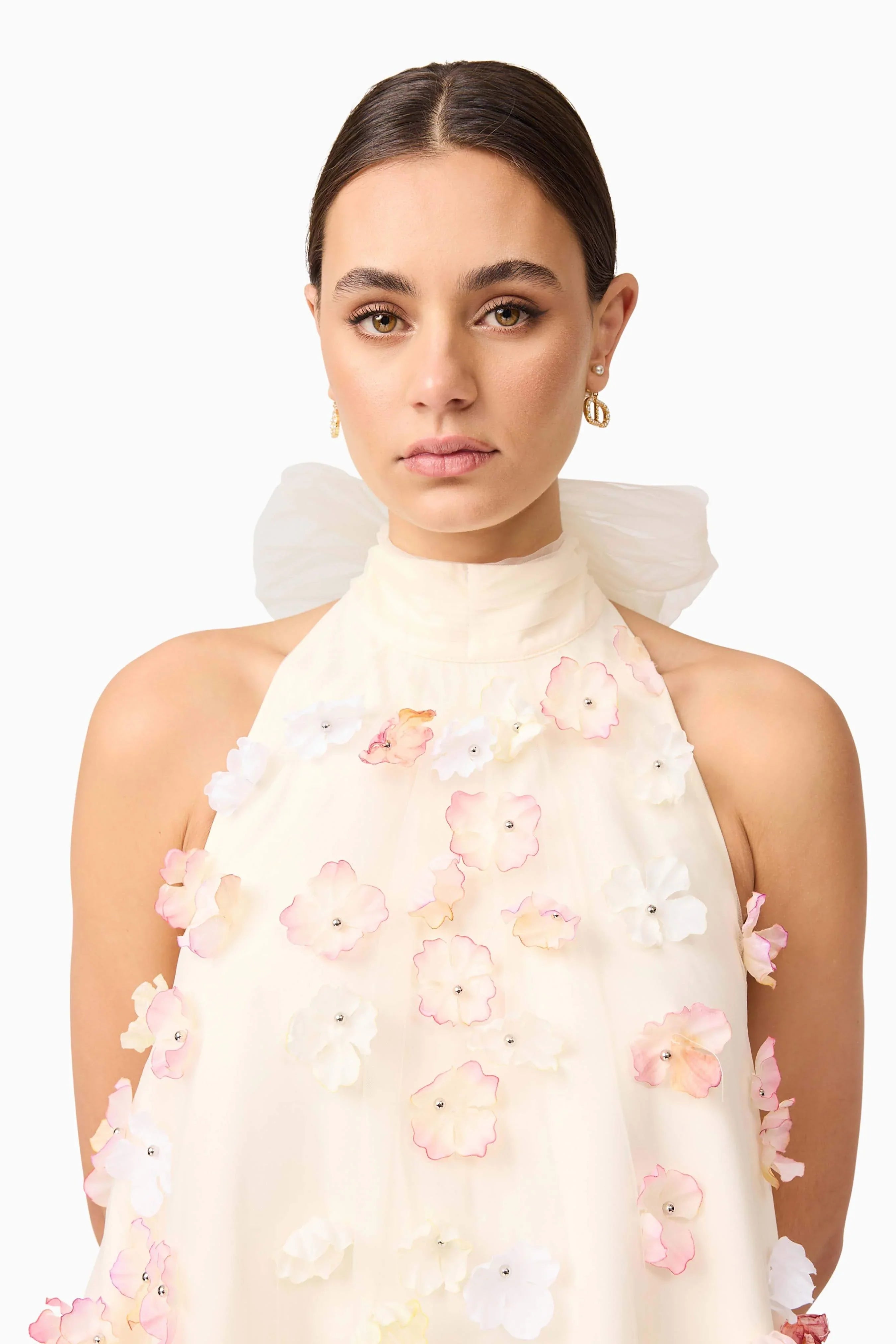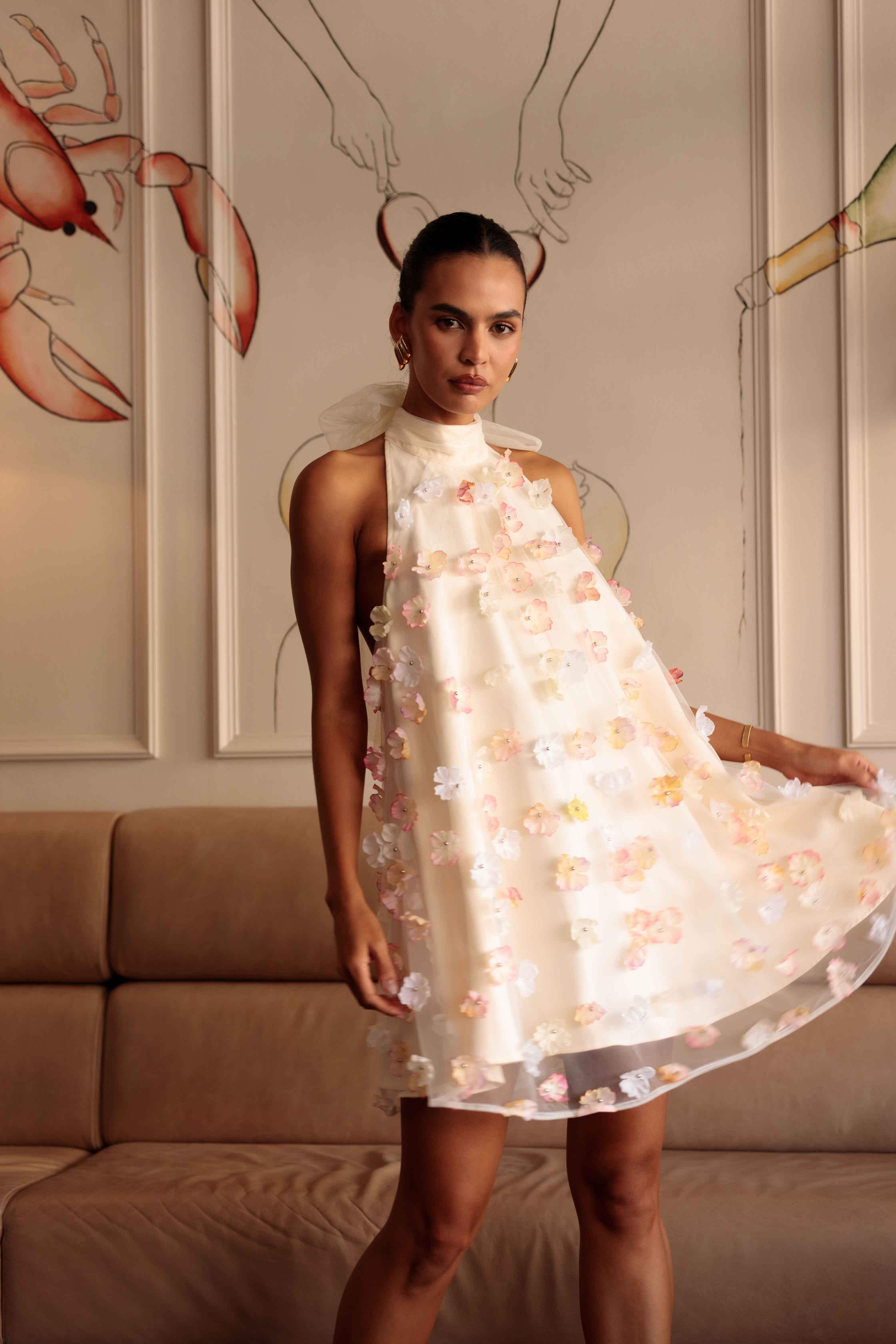 With a relaxed and flowy fit, the baby-doll mini dress effortlessly drapes over the body, offering comfort and elegance. The combination of the delicate 3D floral tulle fabrication and the airy silhouette creates a light and romantic feel, ideal for spring and summer occasions.