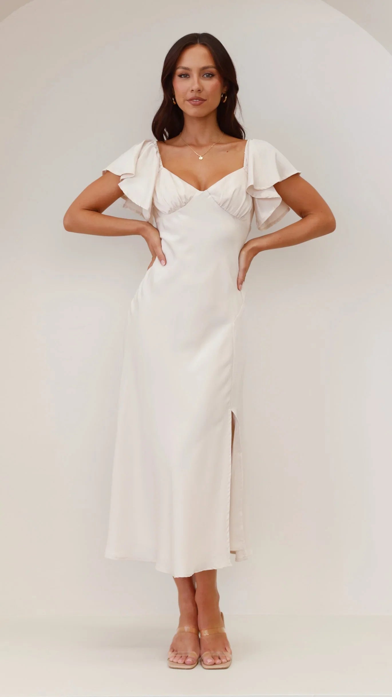 Our Louisa Dress features beautiful butterfly sleeves, flattering off shoulder design, pleated bust and a flirty front slit. This beautiful floaty design takes elegance to the next level - you'll be sure to turn heads in this number. Pair this piece with our and