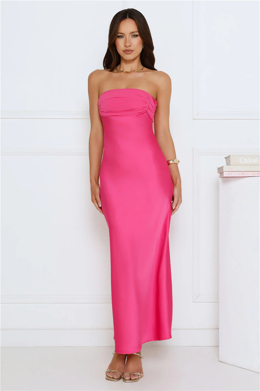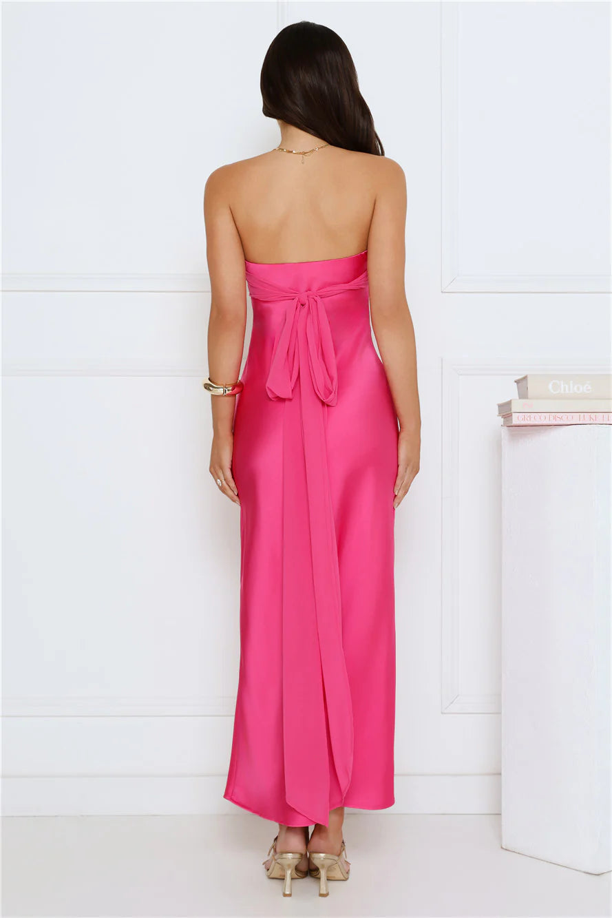 Embrace a soft, romantic look in the Love Club Strapless Satin Maxi Dress, designed with a dreamy chiffon-style top, a gracefully flowy skirt, and a charming tie-back detail for the perfect touch of elegance. Style with heels for all the likes.