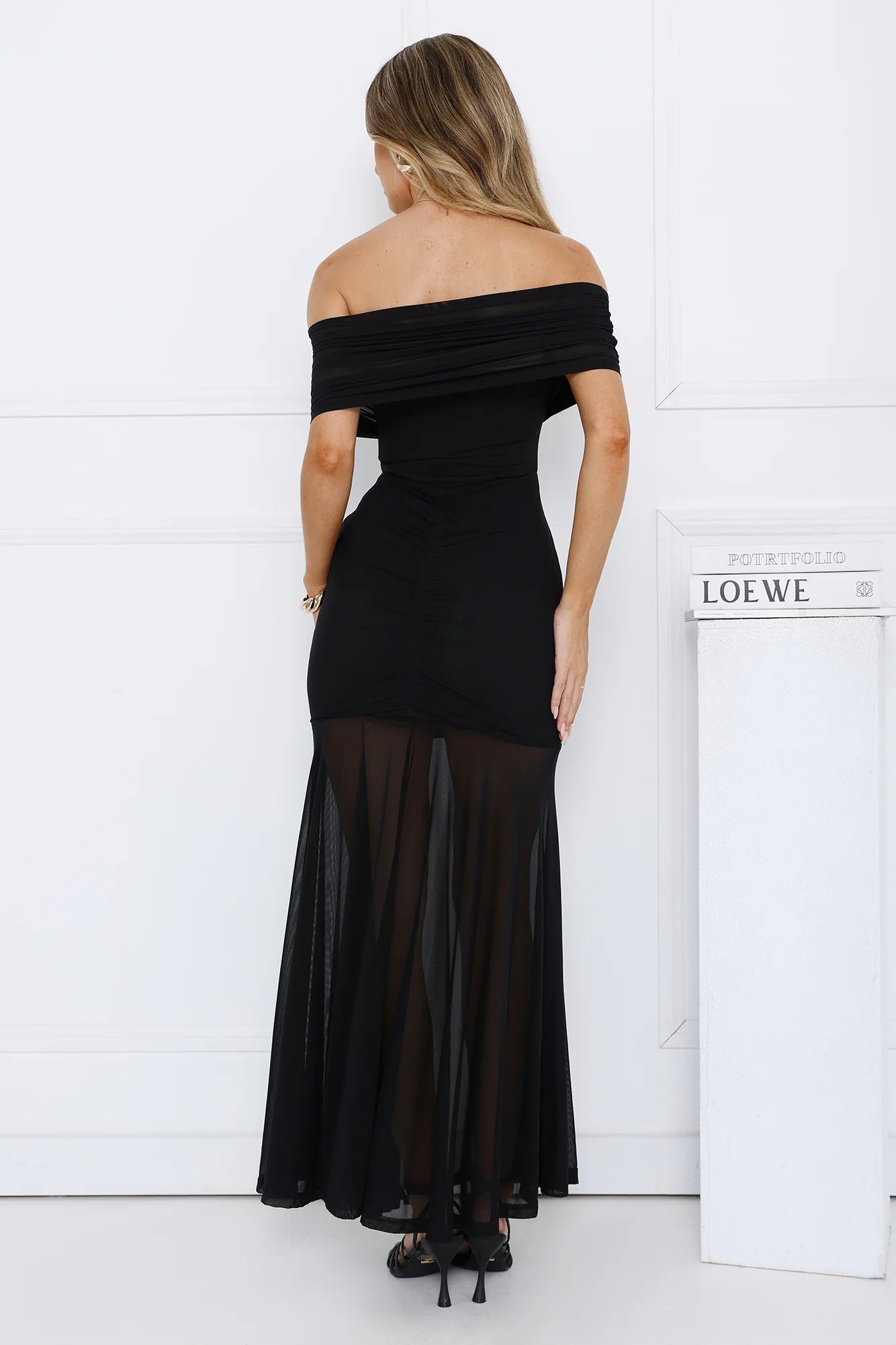 Be admired for your style in the Lumière Off Shoulder Mesh Maxi Dress. This versatile design can be worn strapless or with the included off-the-shoulder piece. Style with heels to steal the spotlight.
