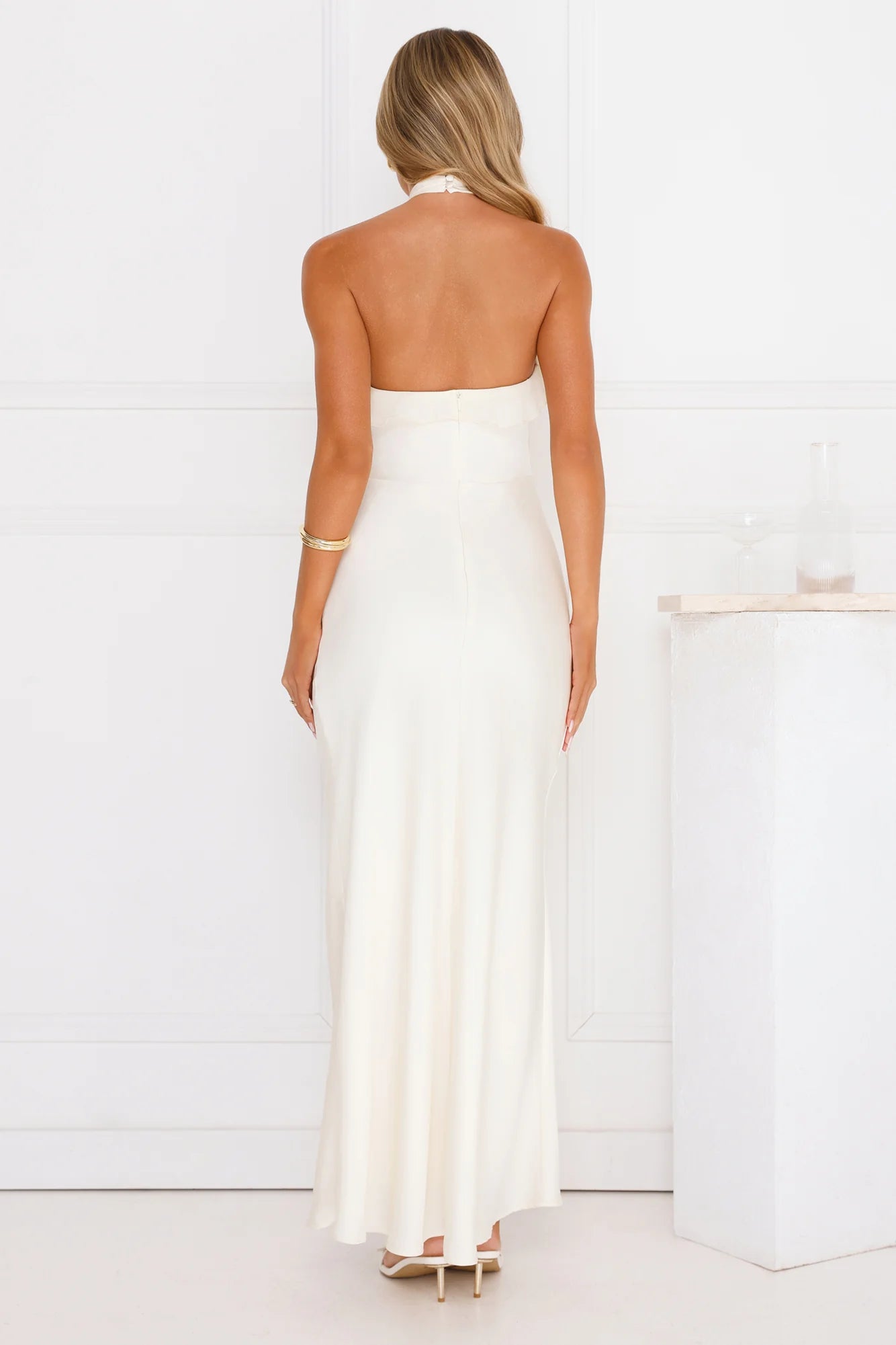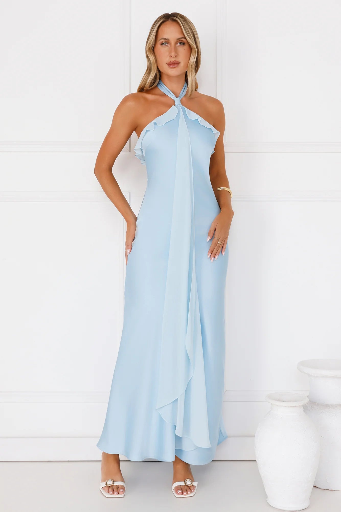 Shine bright in the Luxora Lady Halter Satin Maxi Dress. Featuring smooth satin, a sophisticated halterneck with button closure, and delicate chiffon-style frills, this dress is the perfect mix of grace and glam. Effortlessly chic and made for unforgettable nights. Style with heels.