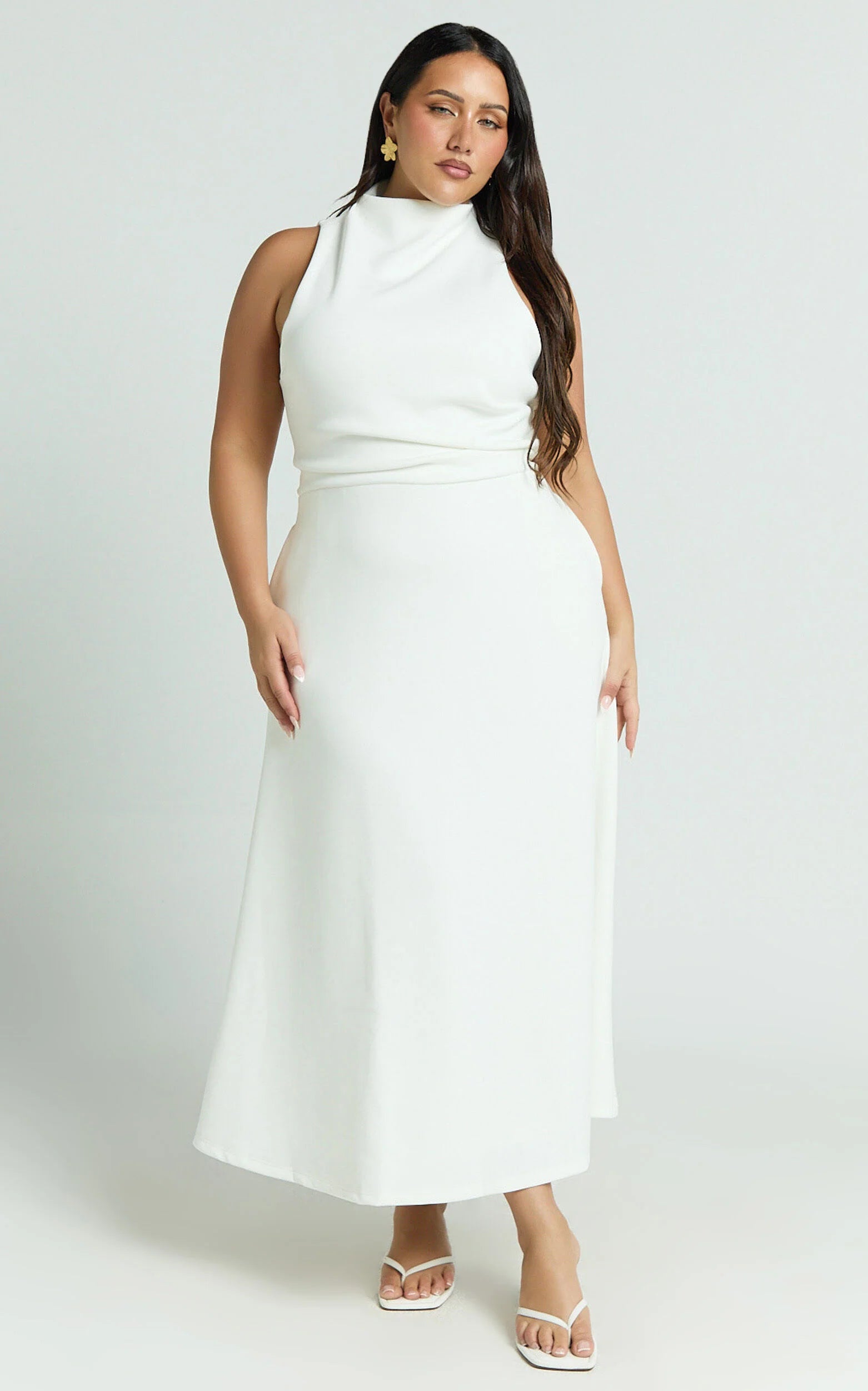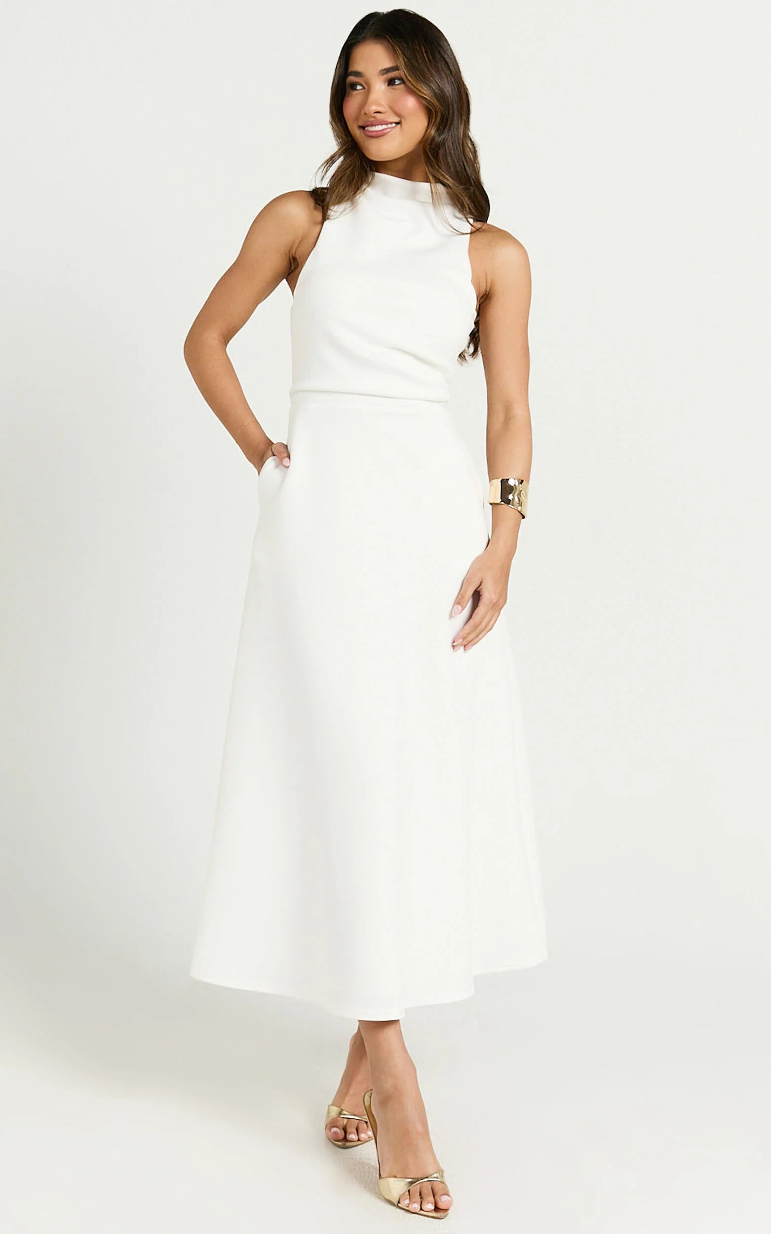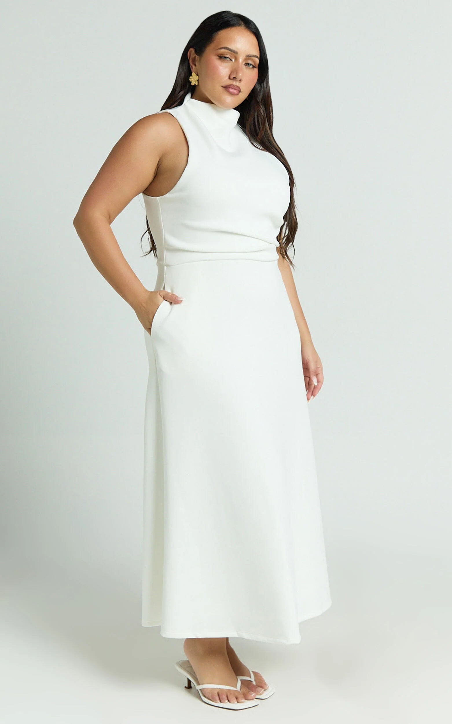 Discover the perfect look in our Macy Midi Dress - a true embodiment of grace and empowerment. This high-neck, sleeveless A-line dress, rendered in an impeccable off-white shade, is your go-to for transcending from a day of confidence to an evening of elegance. Crafted from a luxurious blend of ponte and polyester, this dress promises both comfort and style, seamless for any occasion - from an empowering day at the office to a memorable party night.