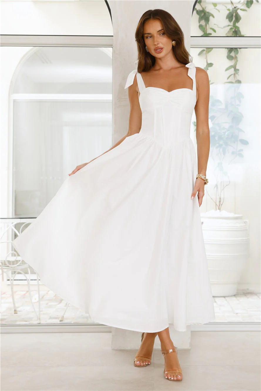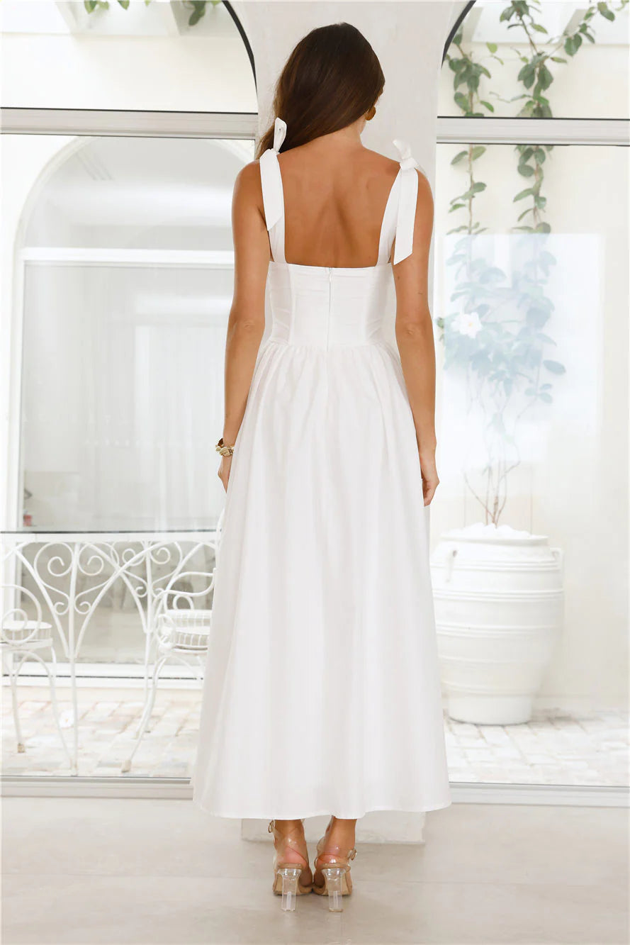 The Magical Dream Maxi Dress is the epitome of elegance, featuring delicate tie-up shoulder straps, a structured boned bodice, and a dreamy flowy skirt that creates an effortlessly romantic silhouette. Style with sandals.