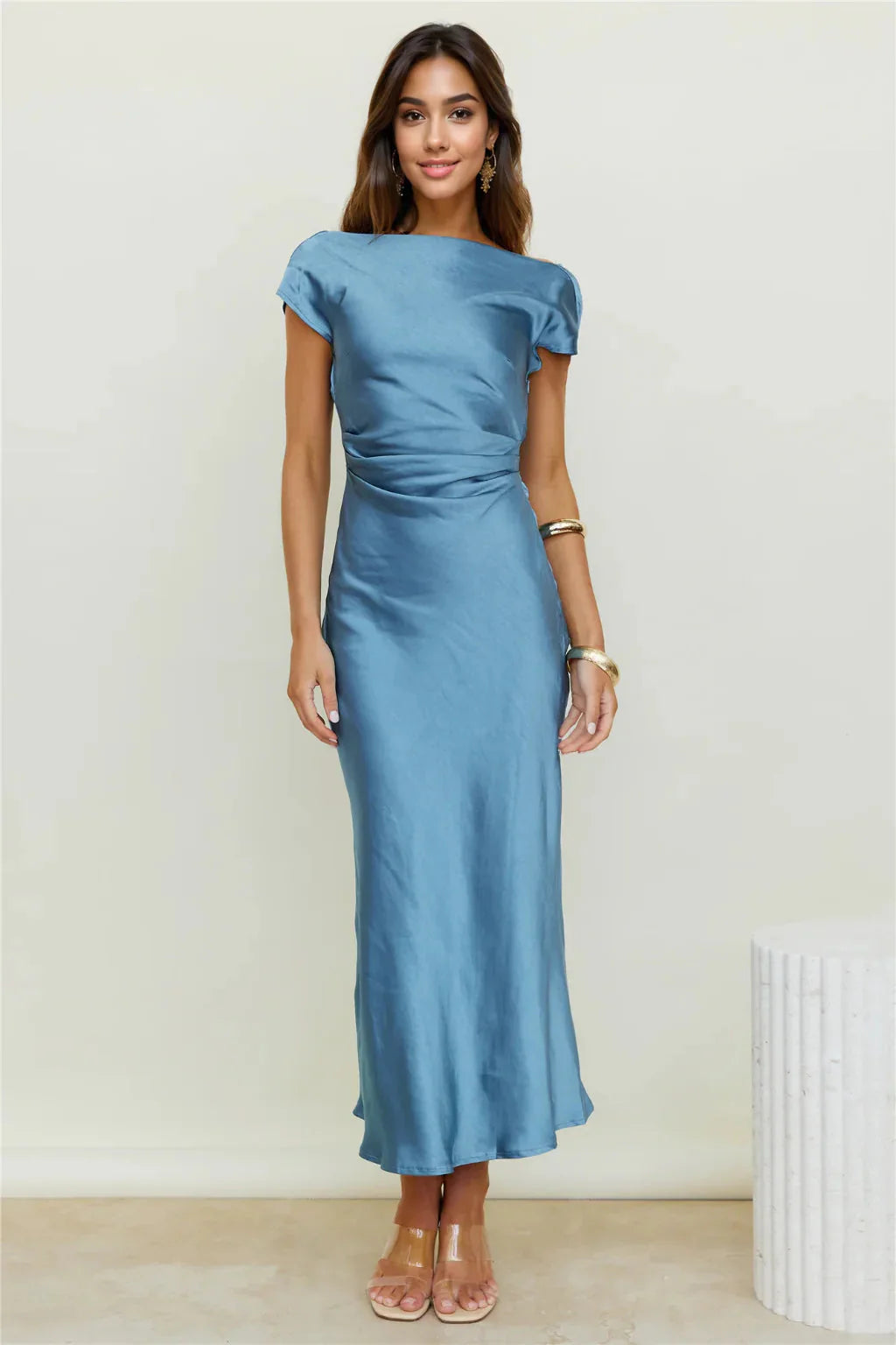 Embrace classic style with the Gisele Maxi Dress in Steele Blue. Boasting a maxi length and a strapless neckline, this dress features a unique cow back detail and an elasticated design for a comfortable and chic fit. Perfect for any formal occasion, this dress will make you feel elegant and stylish.