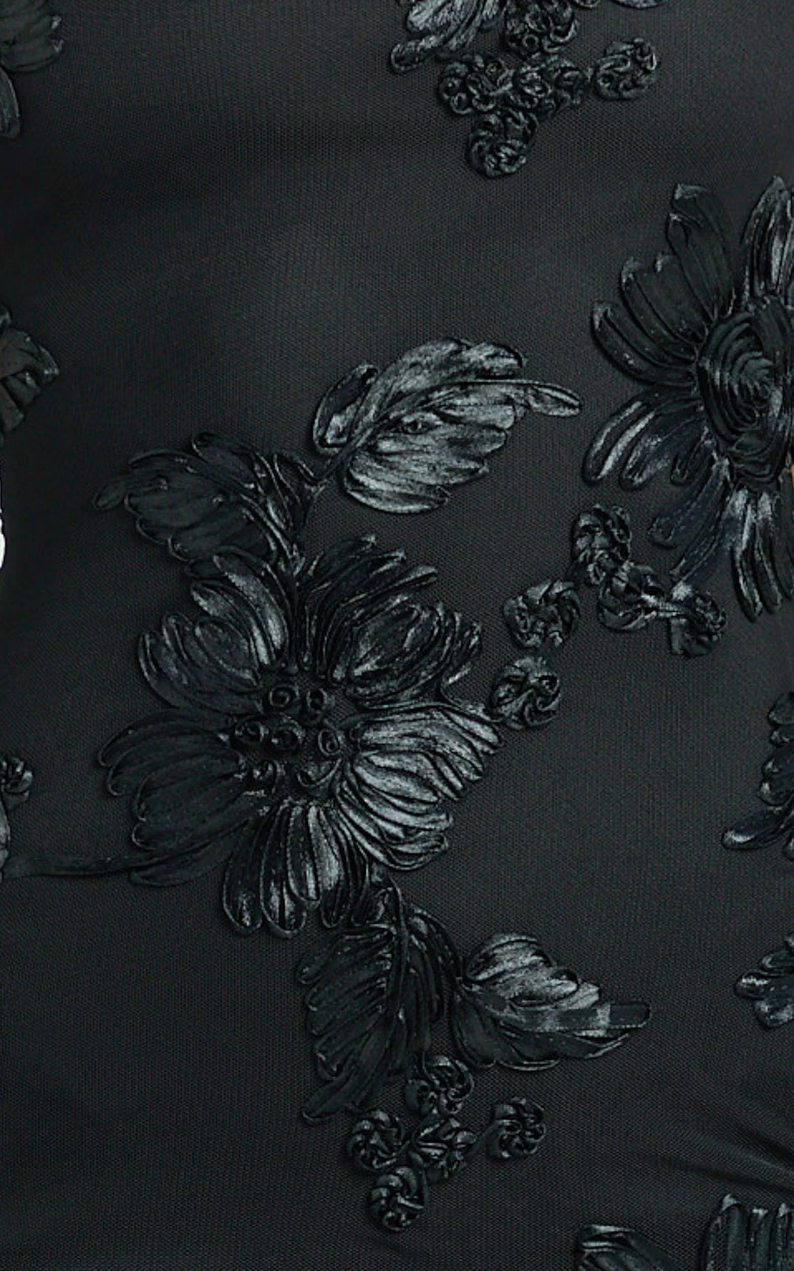 Transform your look with the Mina Midi Dress, a masterpiece of style that defines sophistication and empowerment. This beautifully crafted embroidered mesh dress in classic black is your ultimate companion for those moments when you want to make a lasting impression. Whether you're stepping out as a wedding guest, attending a formal event, or simply elevating your everyday elegance, the Mina Midi Dress is designed to celebrate you.