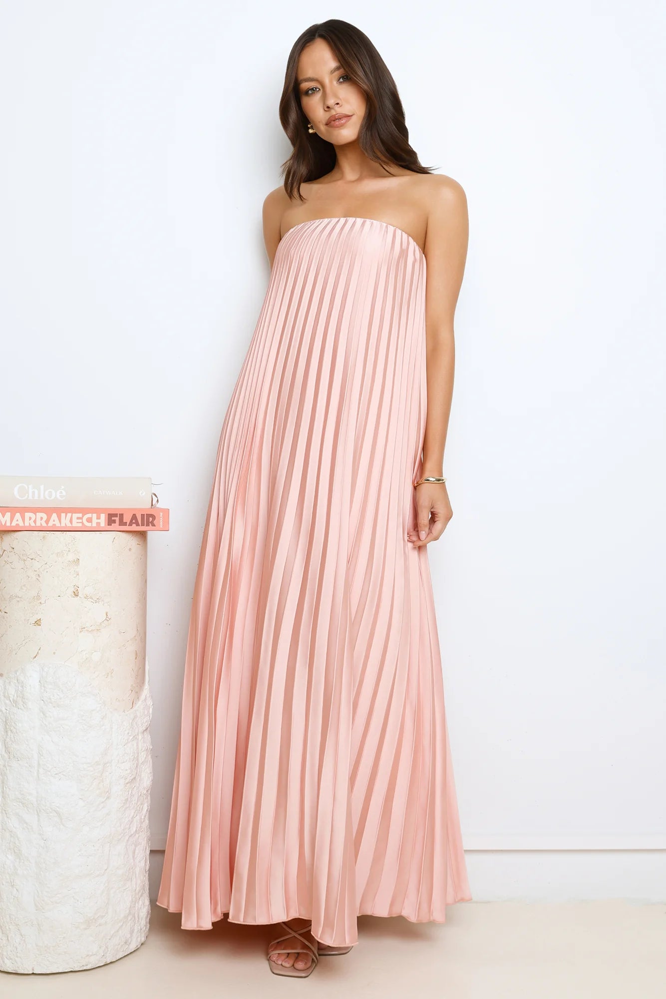 It's giving luxe. The Moonlit Night Pleated Strapless Maxi Dress features a tent style silhouette with a silky satin pleated design and an elastic back. Style with sandals and beachy waves.