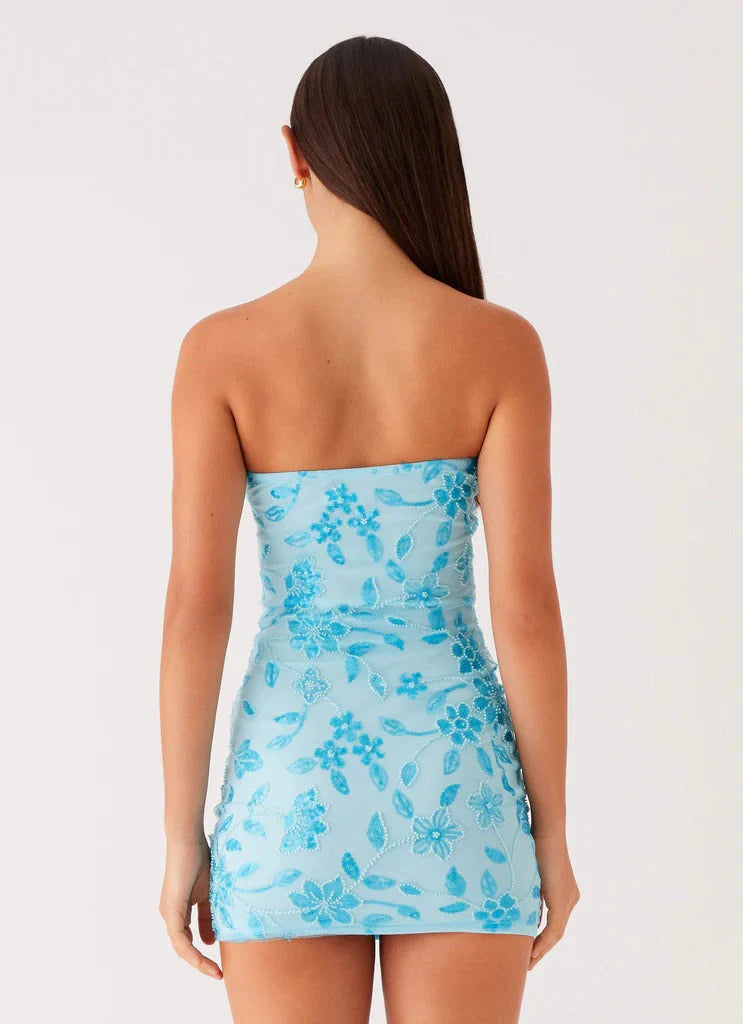 Introducing the Moorey Beaded Mini Dress. With its chic strapless design and intricate sequin and beading embellishments, it exudes glamour and style