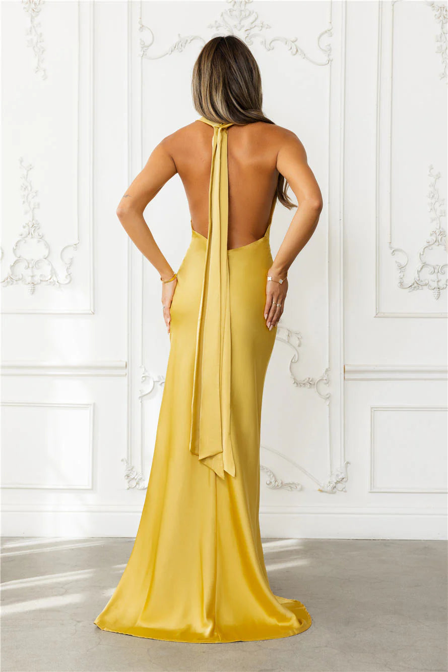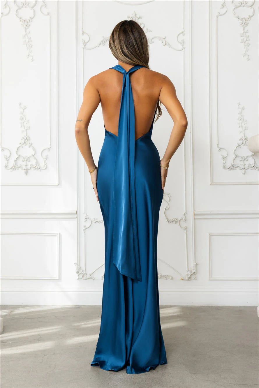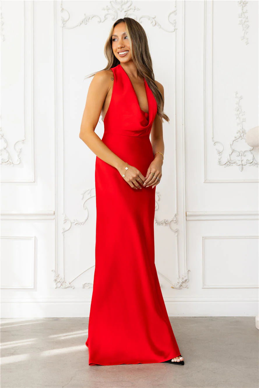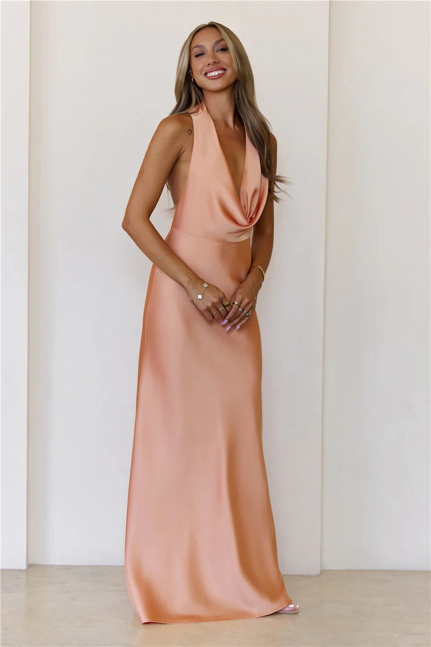 Step into elegance with the Nightfall Noir Halter Satin Maxi Dress, designed with a luxe satin finish, a chic cowl neckline, a halter tie for the perfect fit, and a sultry open back for an effortlessly glam look. Style with heels.