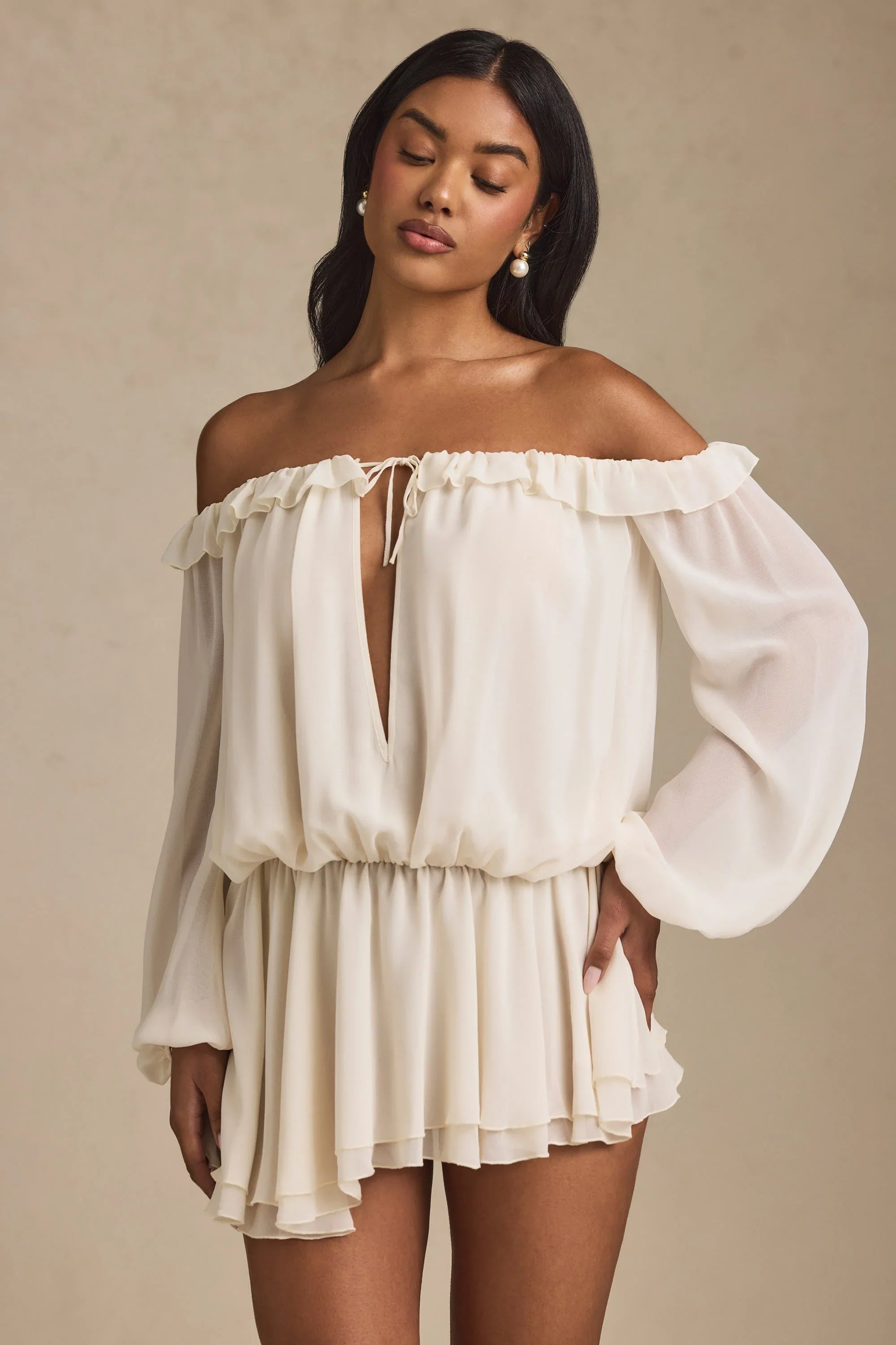 Spring moments, elevated. Lightweight and breezy, the Solana mini dress is crafted from premium chiffon to a relaxed off-shoulder silhouette with oversized balloon sleeves. It features an elasticated waist, plunge keyhole cut-out at the front and an asymmetric tiered skirt. The neckline is traced with pretty ruffles and features functional lace-up ties for a custom look.