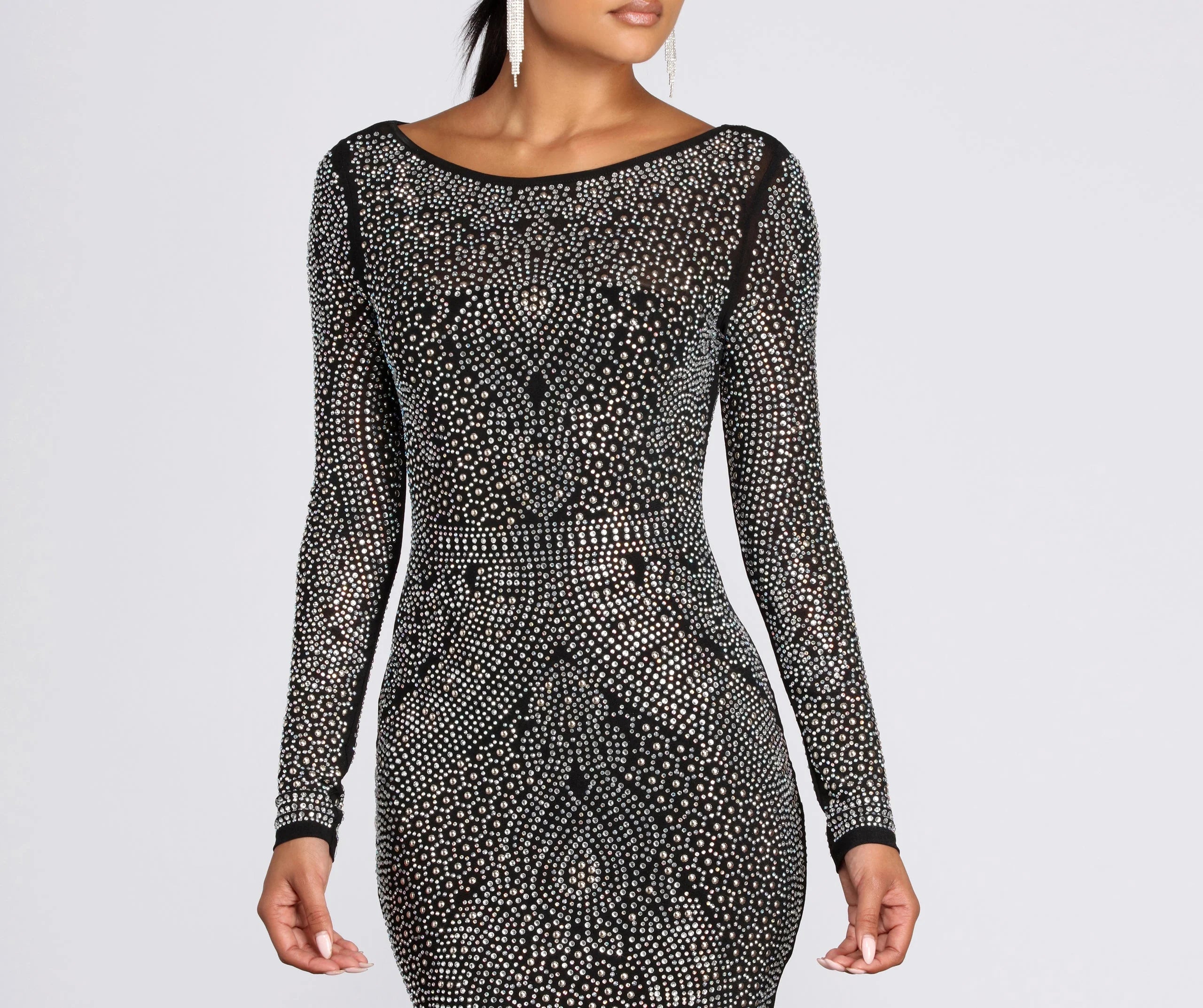 Girl you are on one! This party dress is one for the books. Designed with a boat neckline, long sleeves, and a short mini hemline that meets above the knee. Dress is partially lined at the skirt and composed of a mesh material that offers moderate stretch. A mix of studs, heat stones, and rhinestones adorn this dress in a beautiful pattern that we are obsessed with!